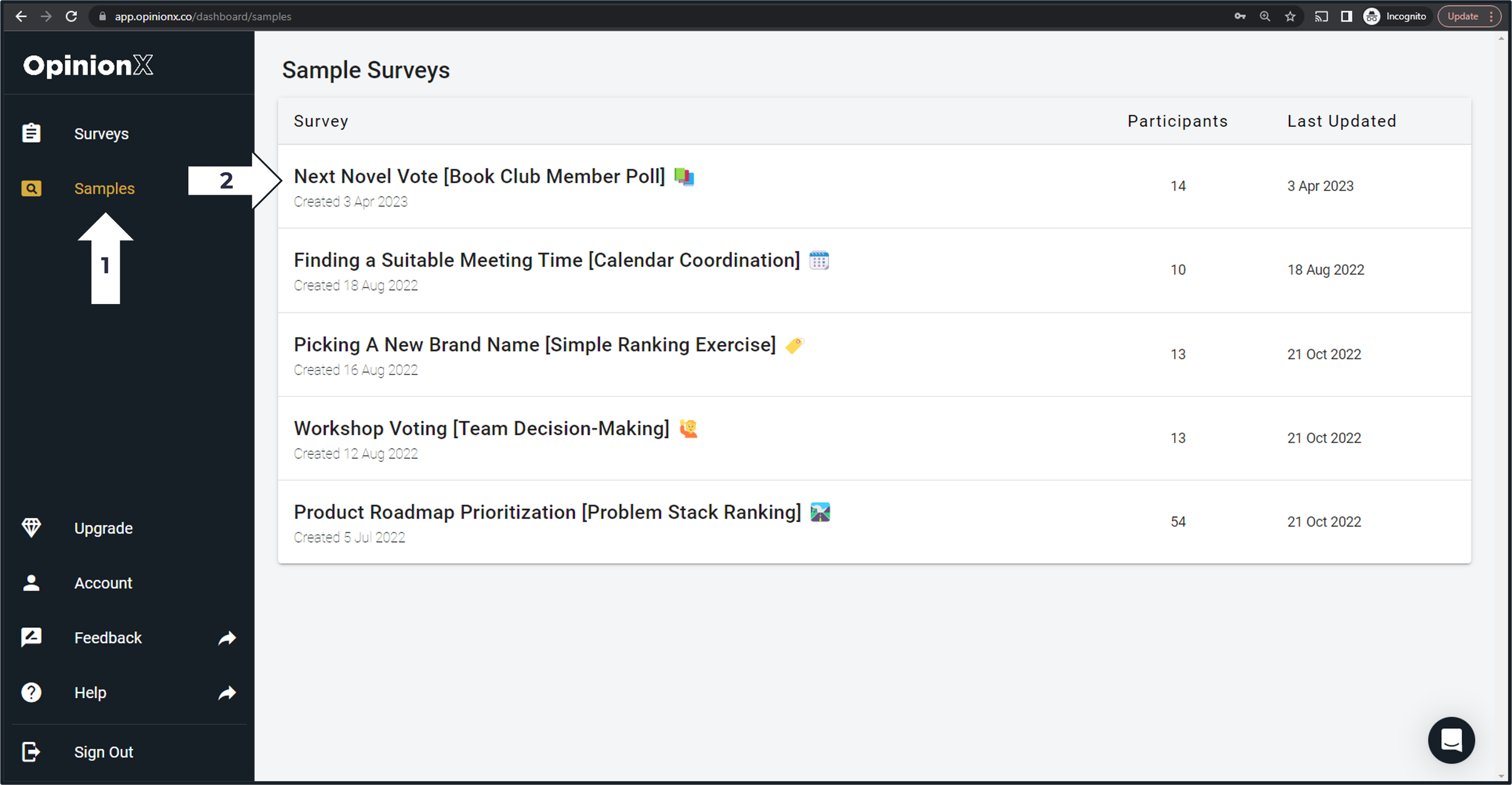 In our sample survey gallery on OpinionX, you can find our “Next Novel Vote” project as an example of what a book club members poll would look like. It includes a list of 7 potential books, a 1-5 star rating on the previous book, and a quick multiple-choice question for participants. You can access that sample survey for free in our sample survey gallery.
