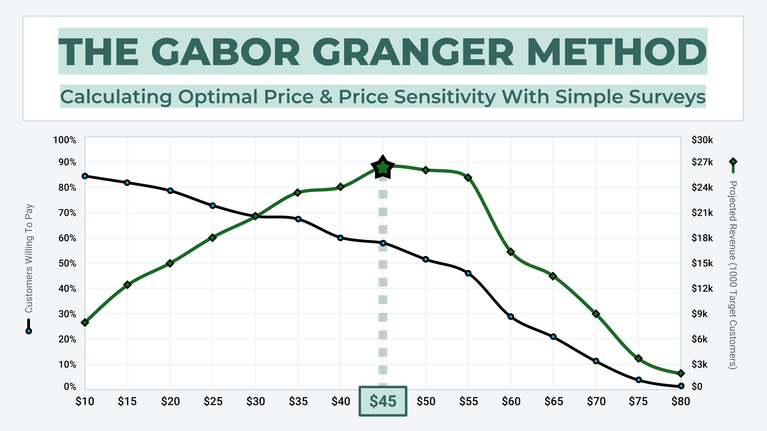 Gabor Granger is a survey that measures the optimal price for a product or service. It works by showing customers a series of hypothetical prices and asking them if they would buy the product at this price or not.