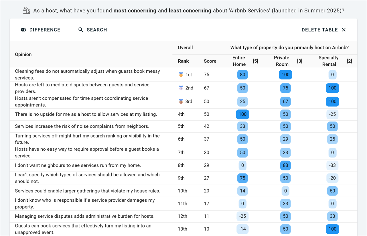 On the table above, the three extra columns with blue numbers show the maxdiff results for three types of Airbnb host: entire home, private room, and specialty rentals.