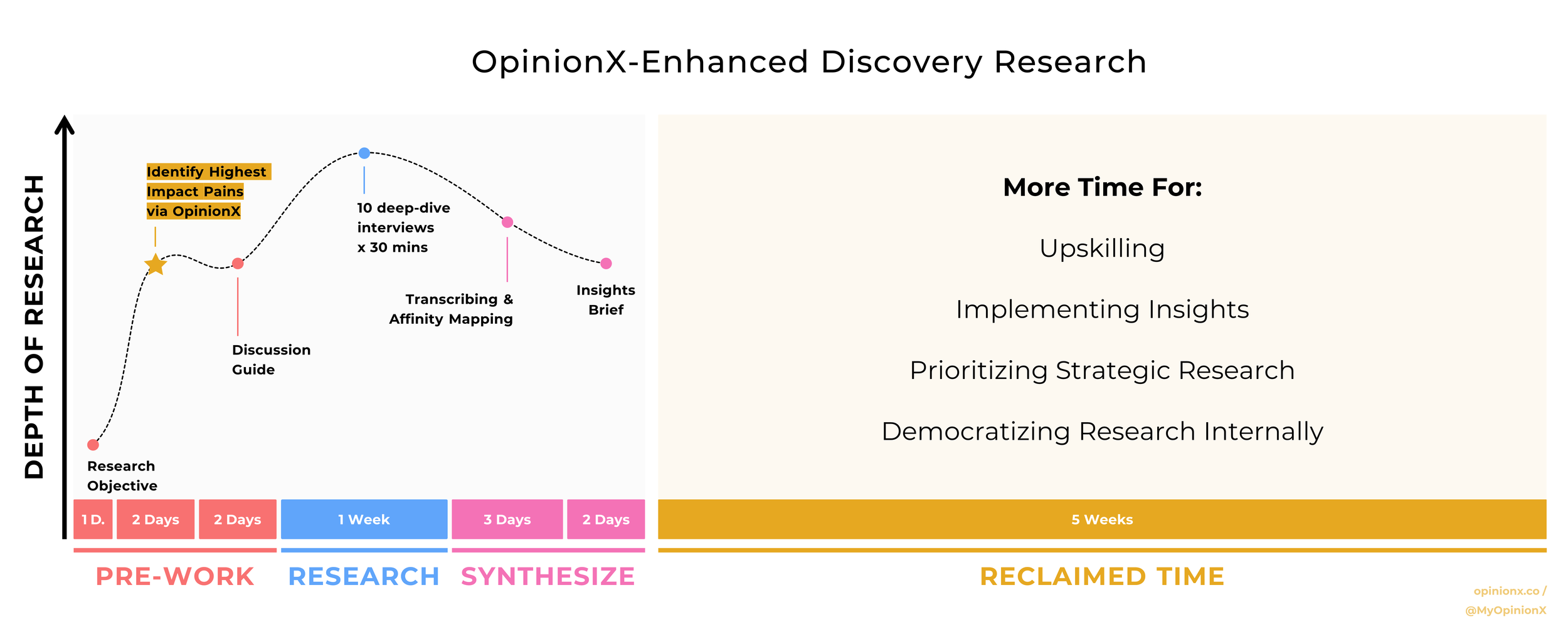 Replacing assumption mapping with a discovery research tool like OpinionX helps you to set a more focused scope based on validated mixed methods insights from the outset, enabling deeper research in a fraction of the time.