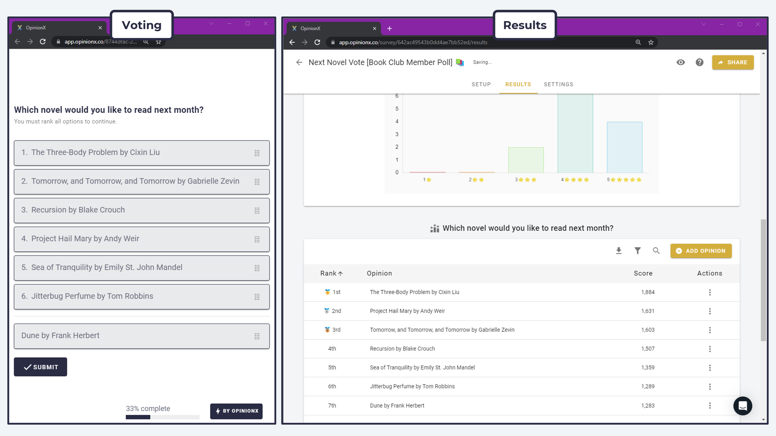 Single-choice voting like this isn’t a very good way to decide what everyone wants to read. A better approach would be to collect each person’s personal preferences and then calculate the overall best result for the whole group. While that sounds pretty complicated to do, OpinionX surveys come with comparative ranking methods like Order Rank and Pair Rank that automatically calculates this for you (all for free).