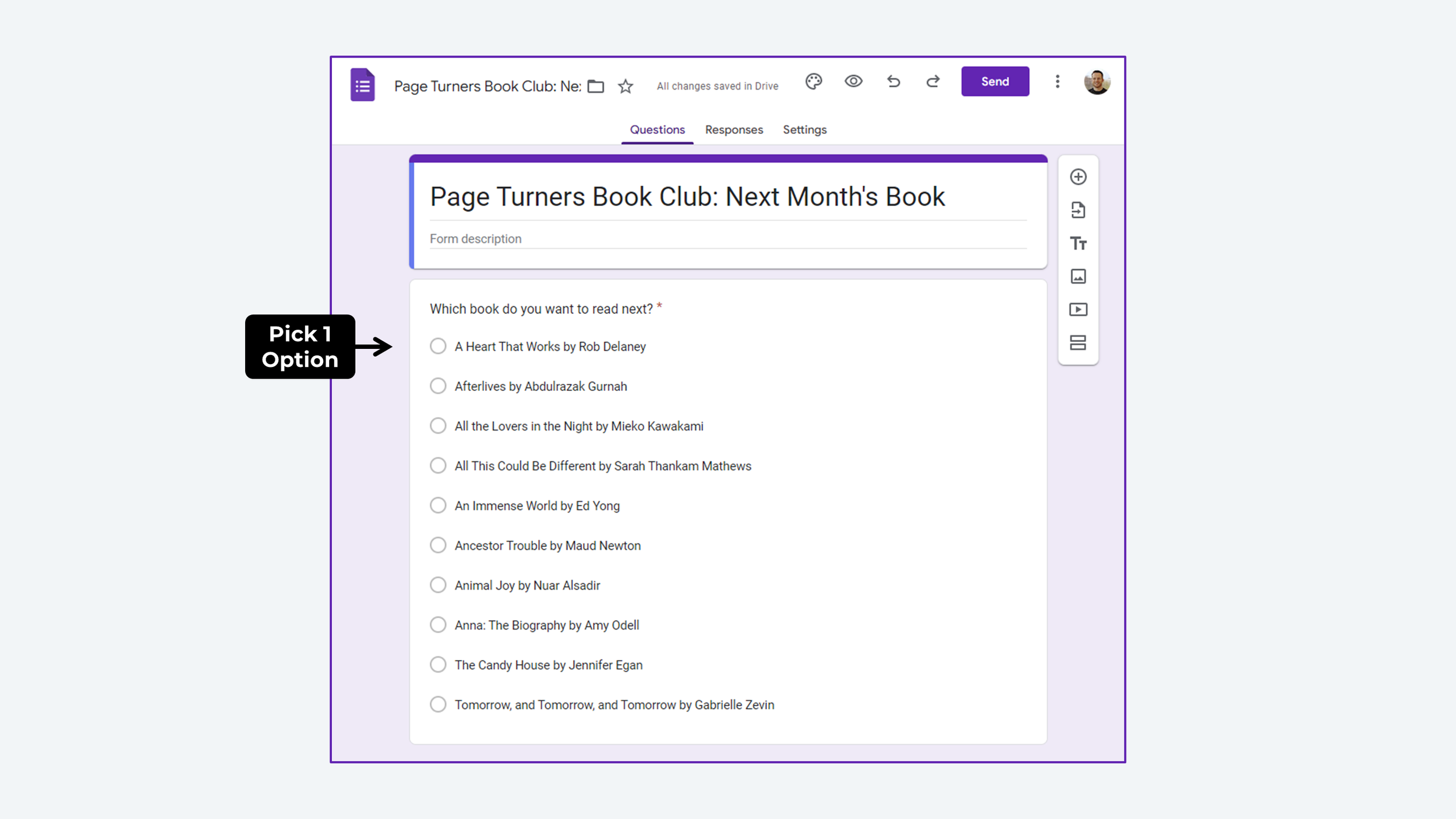 While there are no ranking or voting methods available on Google Forms, it’s worth a quick mentioned considering it’s completely free. If you want to use Google Forms for book club your voting polls, the only question types you can use are the Multiple Choice format (pick one option) or the Checkboxes format (pick as many options as you want).