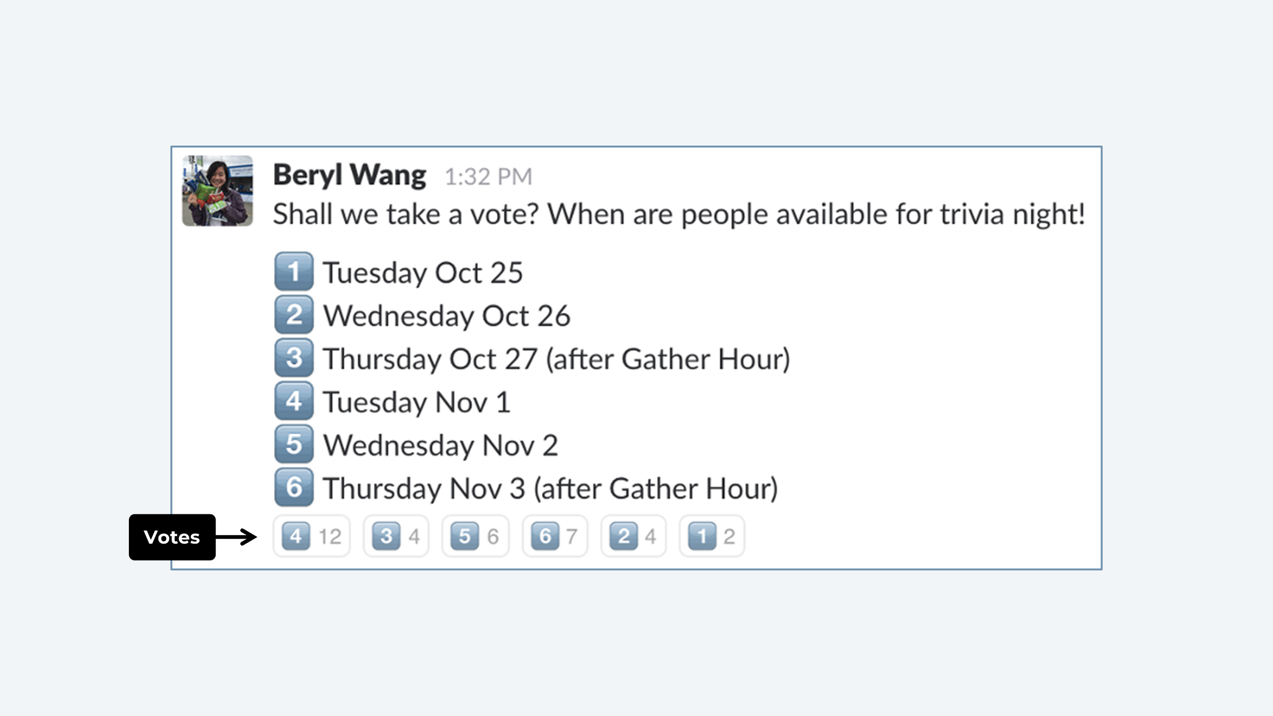 If you host your book club on a community platform like Slack, Discord, WhatsApp, Facebook Groups, etc., a quick and easy way for your members to vote is by using a emoji reactions. For more info, check out Lifewire’s guide: How to Create a Slack Poll Using Emoji Responses. Here’s a great example from a Slack workspace: