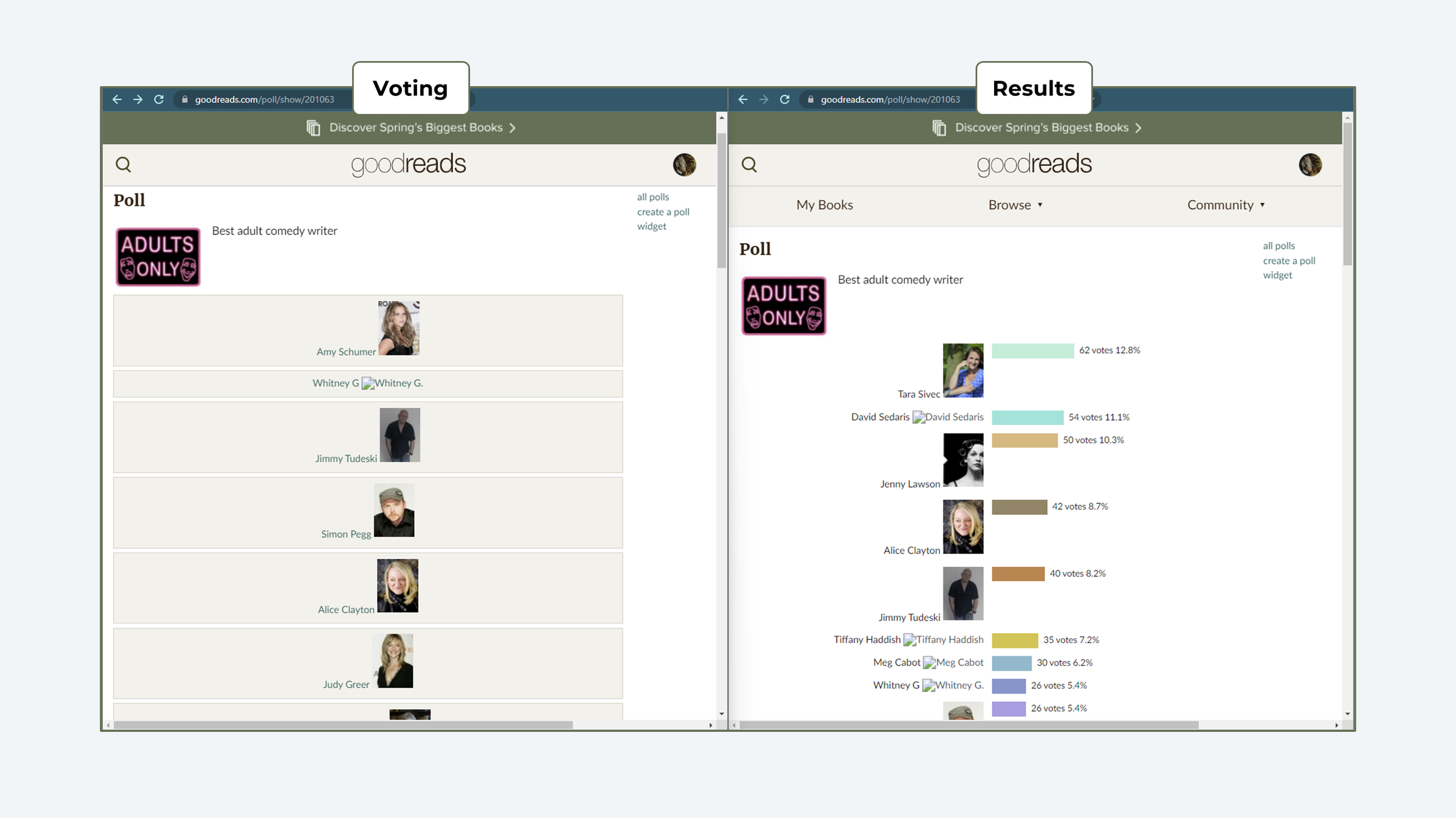 If your book club members are already reviewing books they read on Goodreads, why not keep them there and use the built-in Goodreads Poll feature? You can put a quick one-vote selection survey together in minutes and share a link with your members or embed it on any webpage. Here’s an example poll I found on Goodreads: