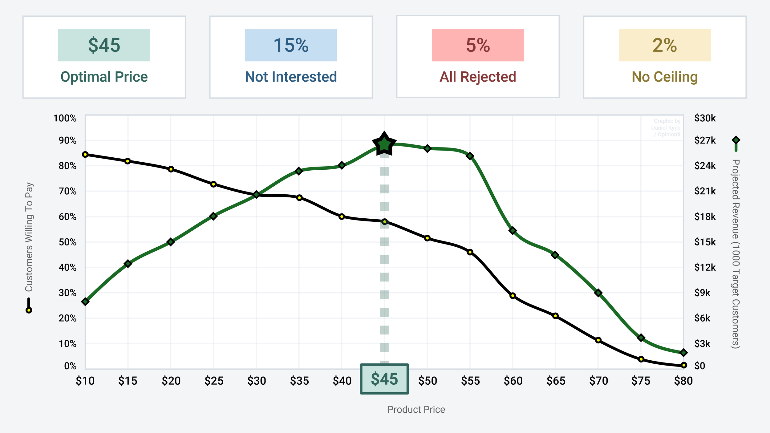To find the Optimal Price that will maximize revenue generation for this product, look for the highest point on the Projected Revenue curve, which in this case is at $45 on the x-axis: