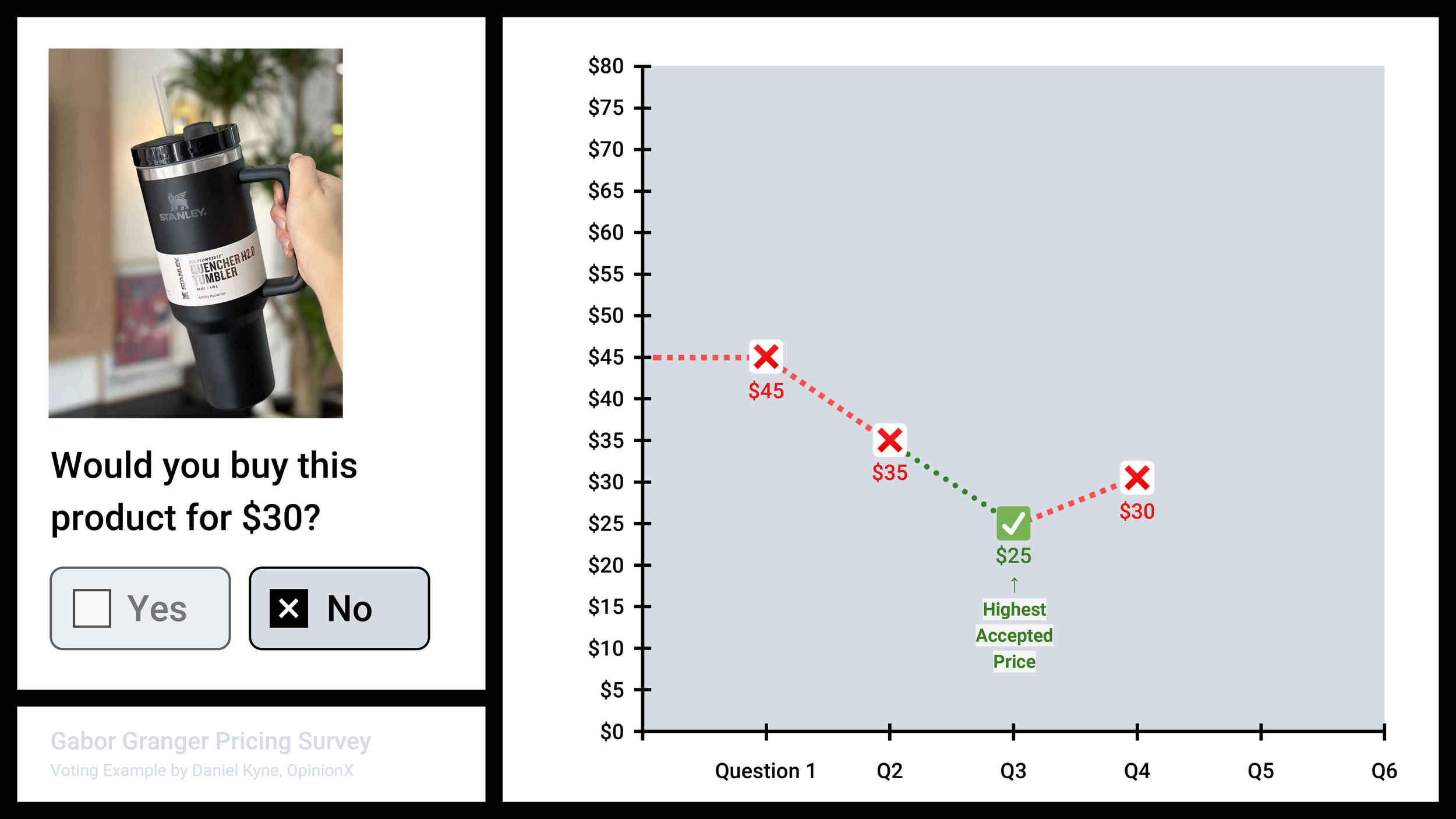 Alternatively, if the respondent votes no on the first price point shown, then the survey will show decreasing prices until they vote yes to buy the product, like this:
