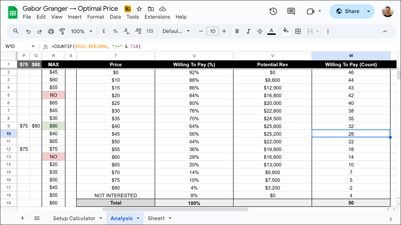 After running my own Gabor Granger survey, I exported the results to Google Sheets (open the tab named “Sheet1” on this example to see how the raw survey data looks). Then I created a separate tab to run my analysis.