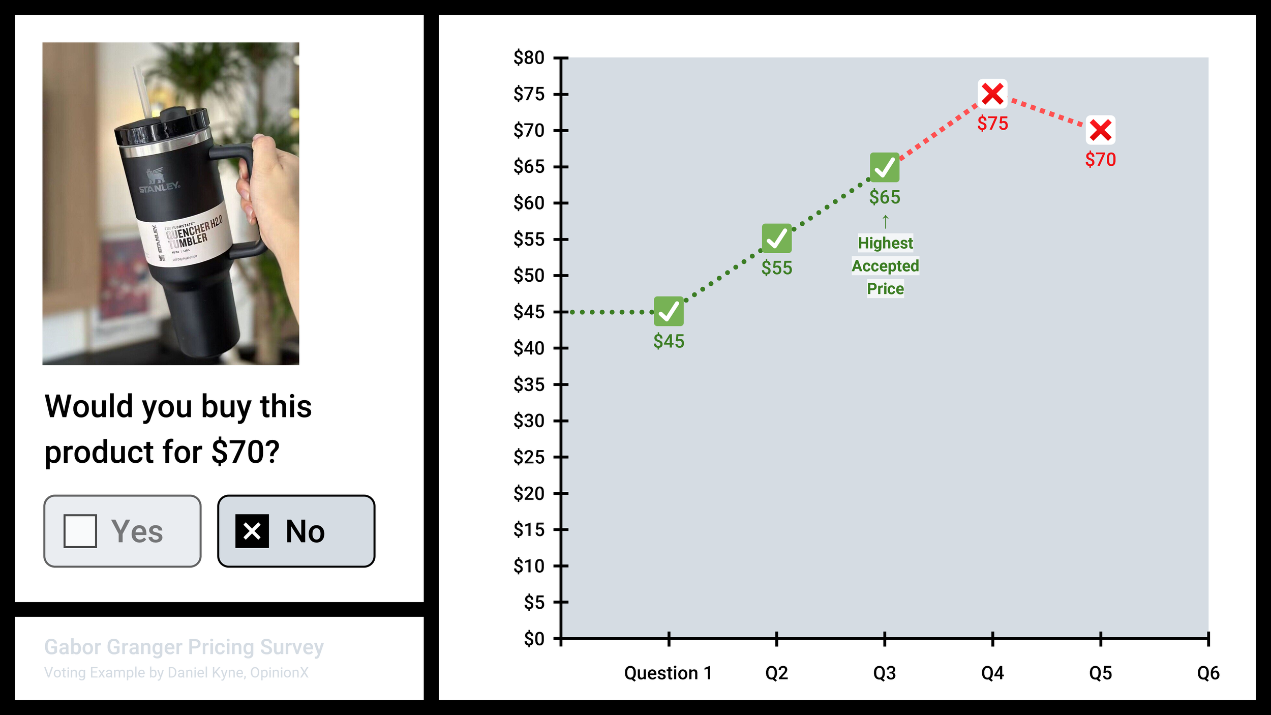 In the example above, the first price shown for the Stanley Cup is $45. Because the respondent voted yes, they are subsequently asked the same question at increasing price points ($55, $65). Once they vote no to a price ($75), then one final question is shown that uses the midpoint between the previous no ($75) and the highest price they said yes to ($65), which in this case is $70.