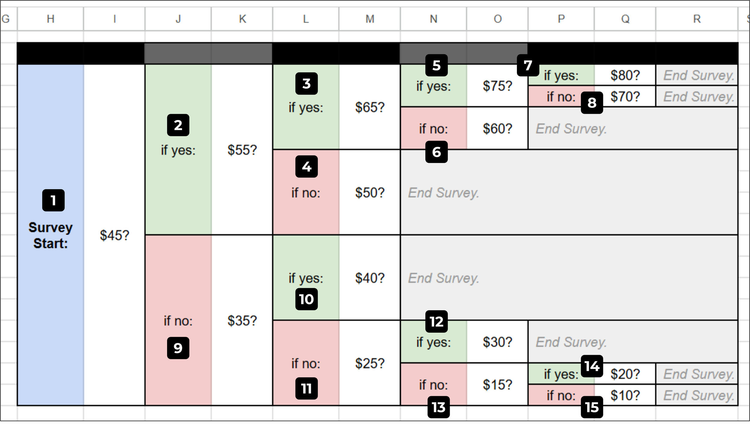 Consistent Price Gaps -- In the flow chart picture, there’s a consistent $5 gap between each of the fifteen price points. Keep the step change consistent like this to ensure a smooth survey experience for participants and a much easier analysis process for yourself later on.