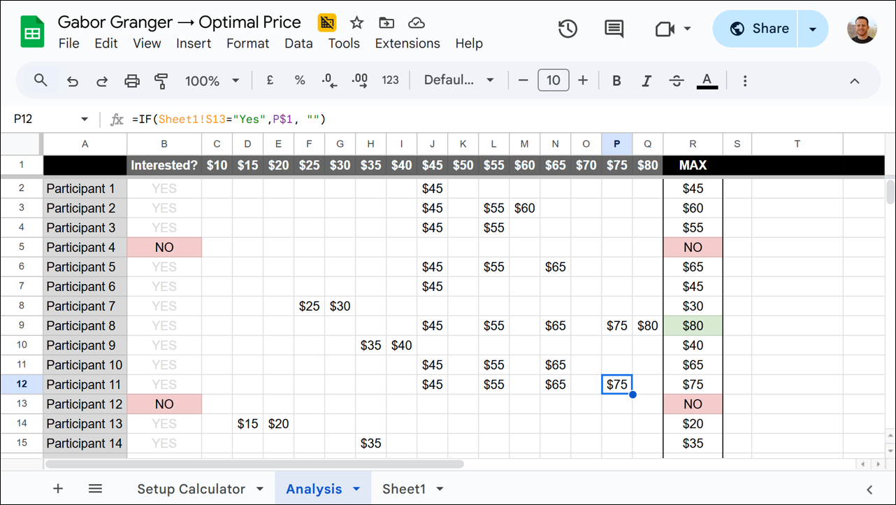 On my analysis tab, I used spreadsheet formulas to find all the prices each participant voted yes to buying. I used this new table to pull out the highest acceptable price for each person in the MAX column at the end. Here’s how this looked:
