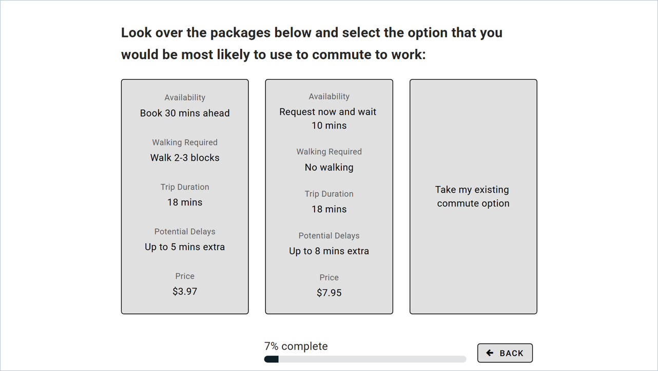 For PerfectPool, the “features” they would include were Availability, Walking, Trip Duration, Potential Delay, and Price. Each of these factors contained a range of options (eg. No Walking, Walk 1-Block, Walk 2-3 Blocks). Below you’ll see an example of the inputs they added to their conjoint survey: