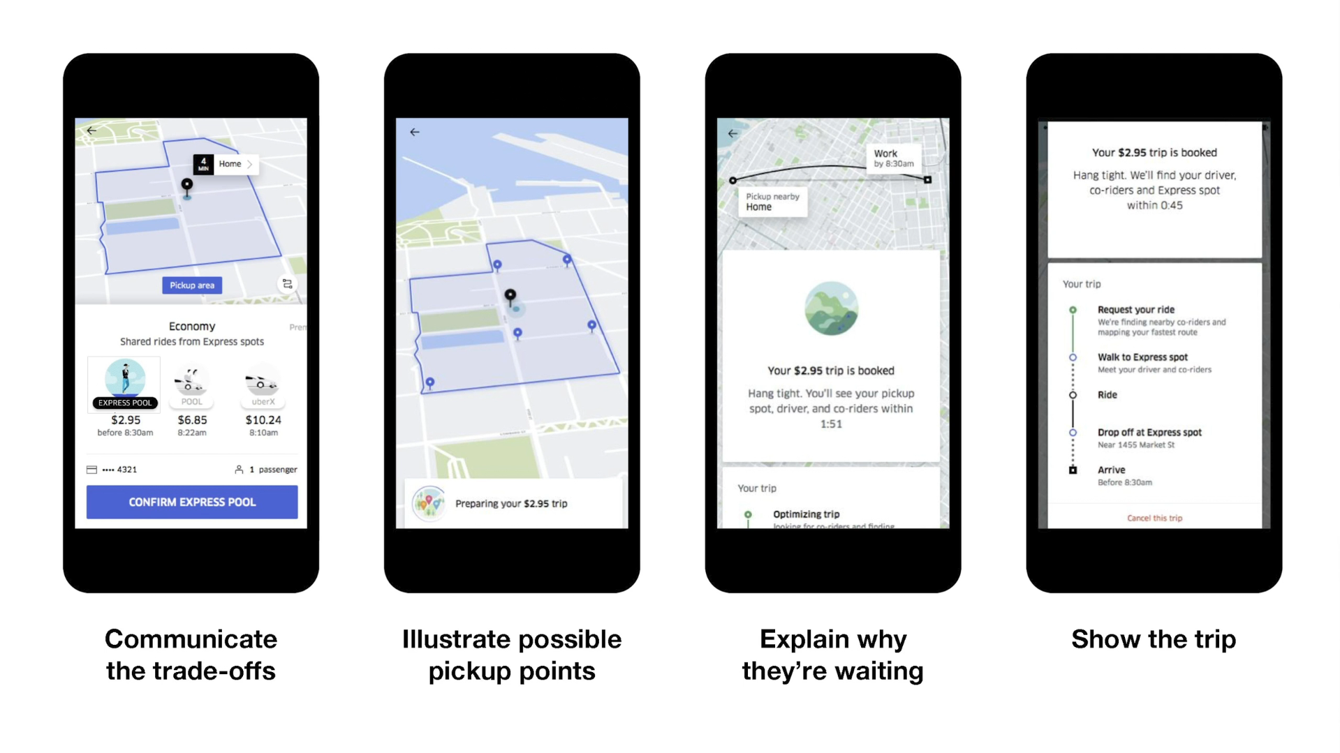 After several iterations, they landed on a design with clear pickup zones and transparent info on price, wait time, and walking distance -- giving riders the ideal amount of context to decide whether ExpressPool was right for their trip.