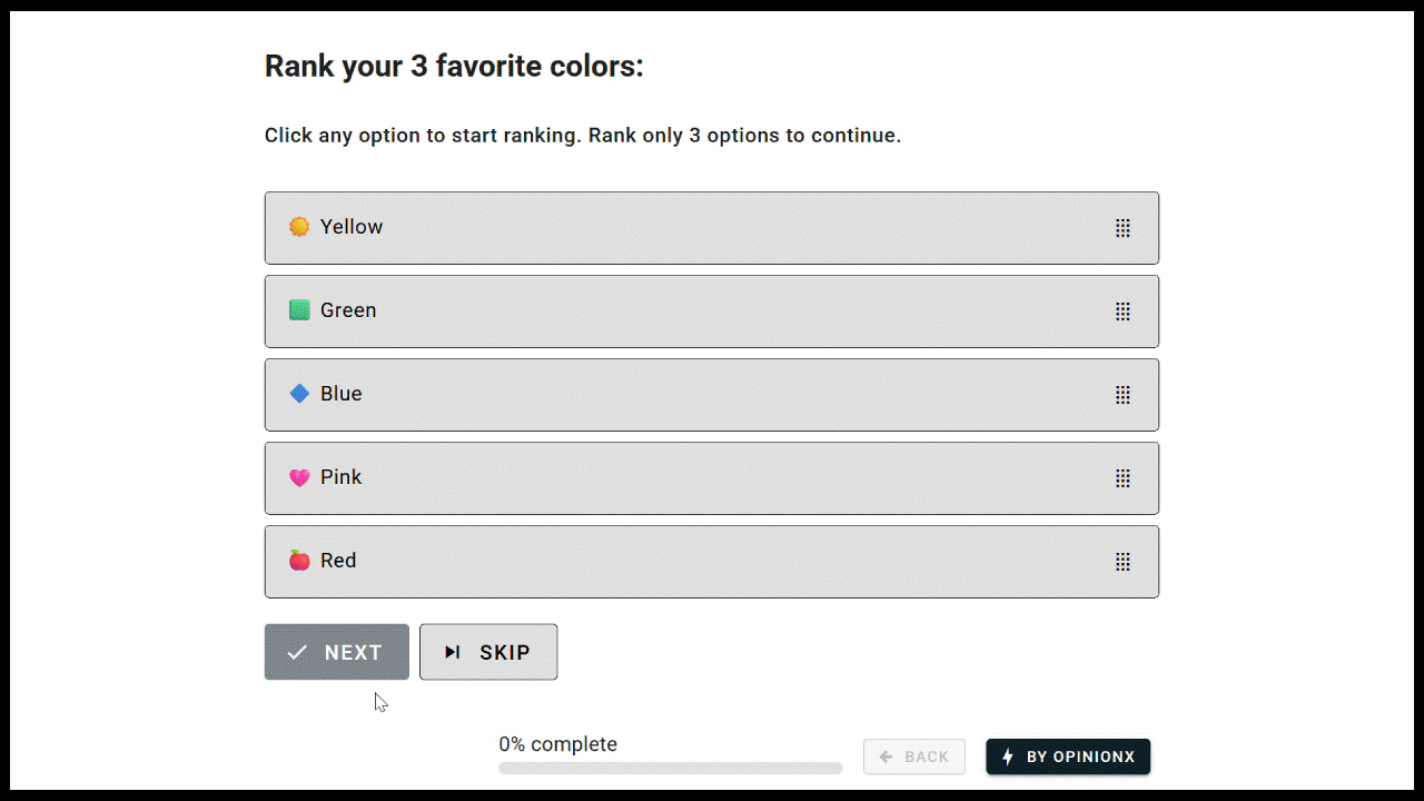 Below you can see an example on an Order Rank survey, and this same approach has been added to Points Rank and Multiple Choice block types too.