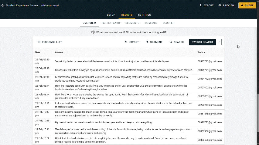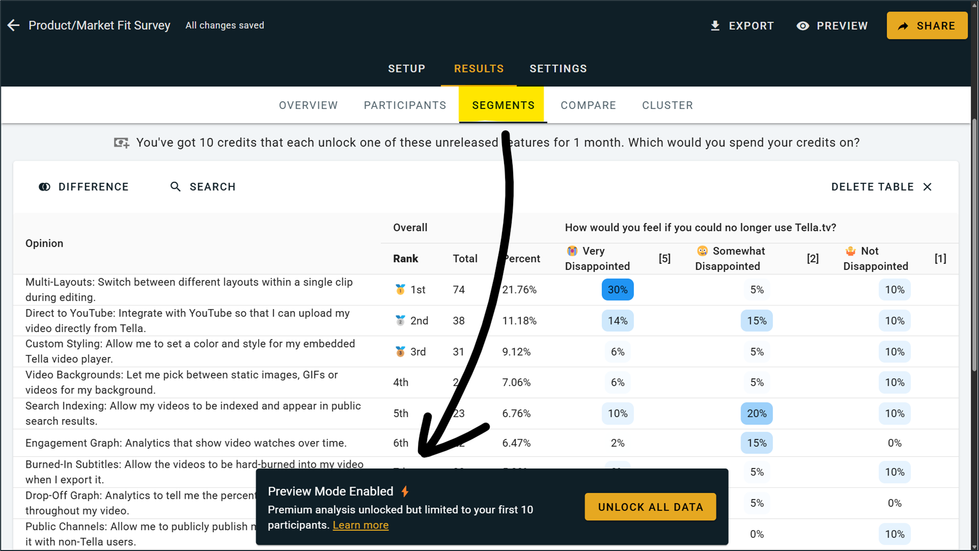 Additionally, we've unlocked the premium analysis features for every survey's first 10 participants, giving you a sneak peak of how OpinionX's functionality works with your own data. This means you can now test out features like exporting, segmentation filters and crosstabs, and participant-level results.