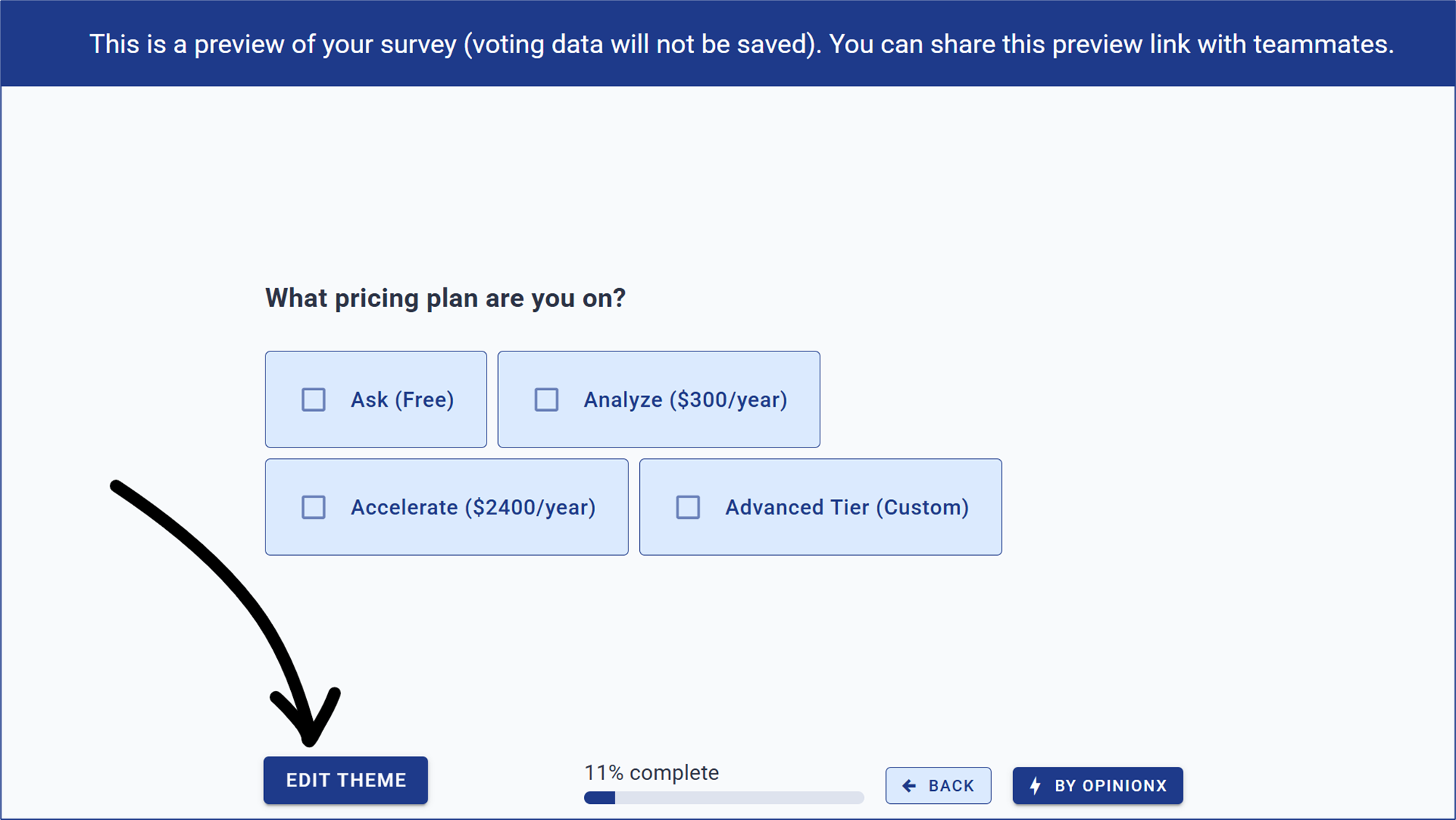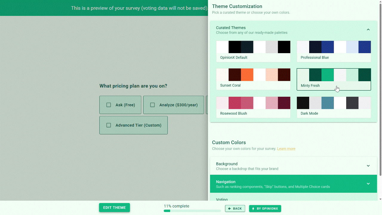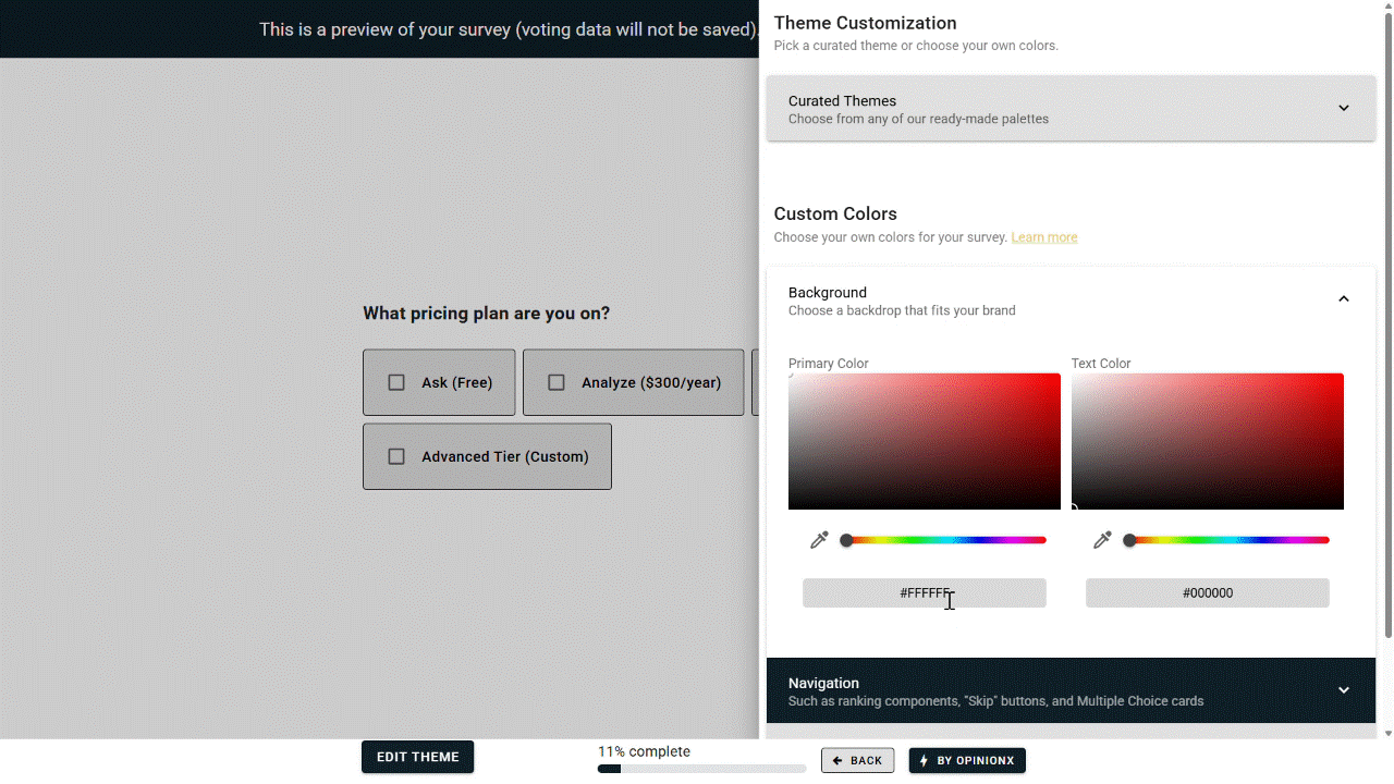 Curated Themes are available to all OpinionX users, while the Custom Colors feature is part of our Accelerate Tier's whitelabeling features bundle along with custom survey URLs and hiding OpinionX's branding.