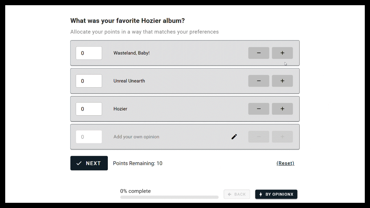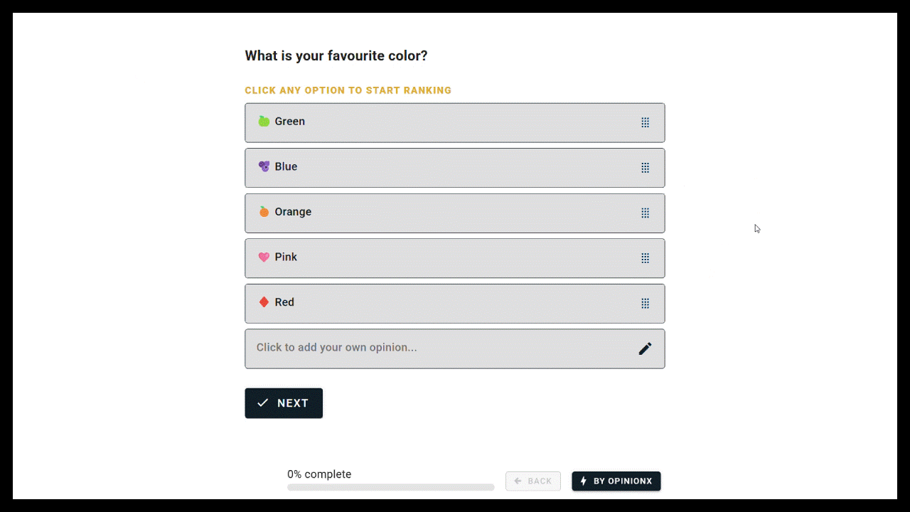 You can now allow survey participants to add their own custom option to your ranking list on Order Rank and Points Rank blocks on OpinionX.