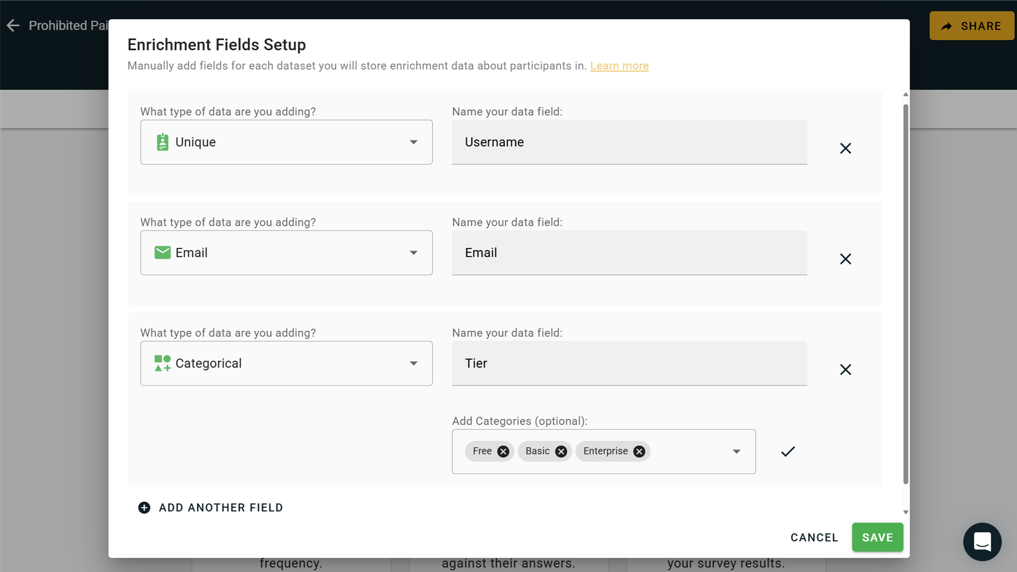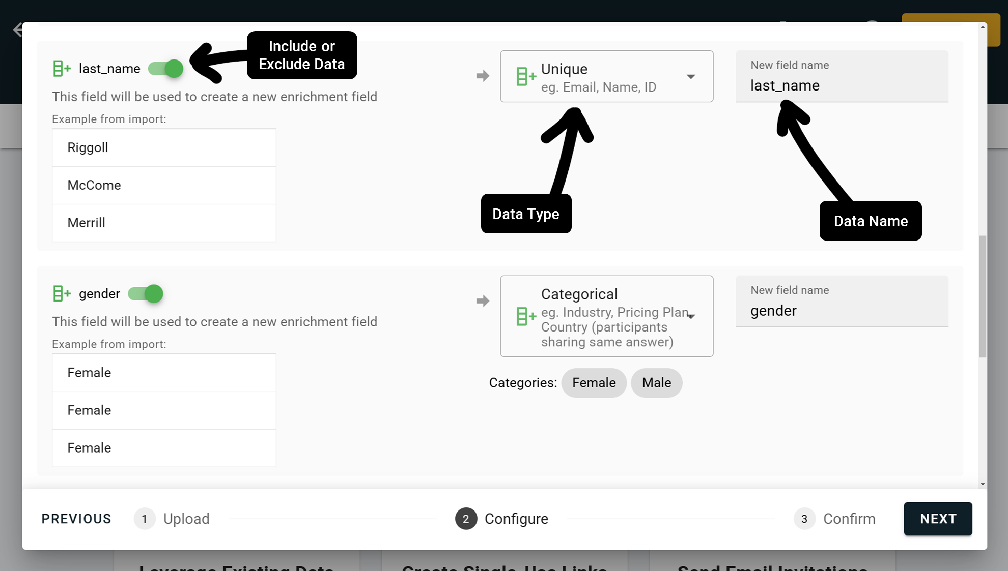 1) Data Type: Is this data Unique or Categorical? Categorical data is when many participants share the same answer (eg. Gender). It's used for tagging participants into groups so that you can filter and segment your results later on. Unique data is free form text where people generally have their own values, like for names, ID numbers, and addresses.