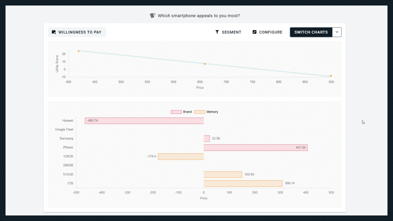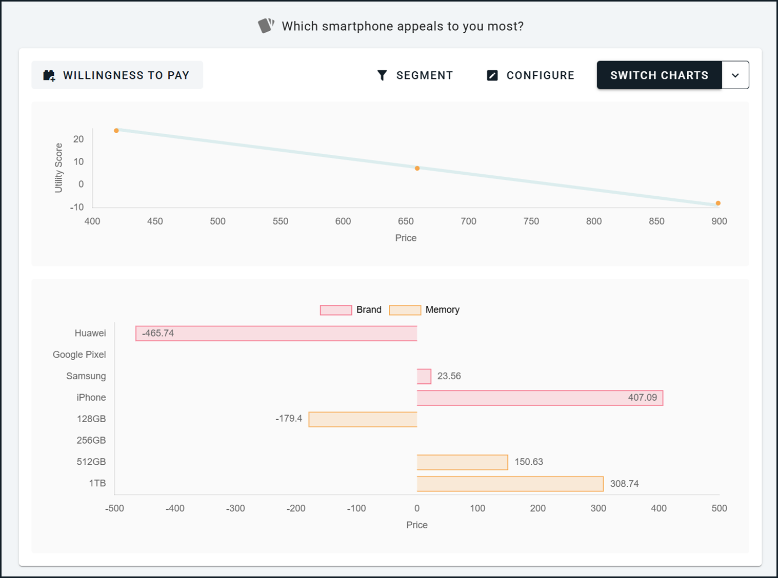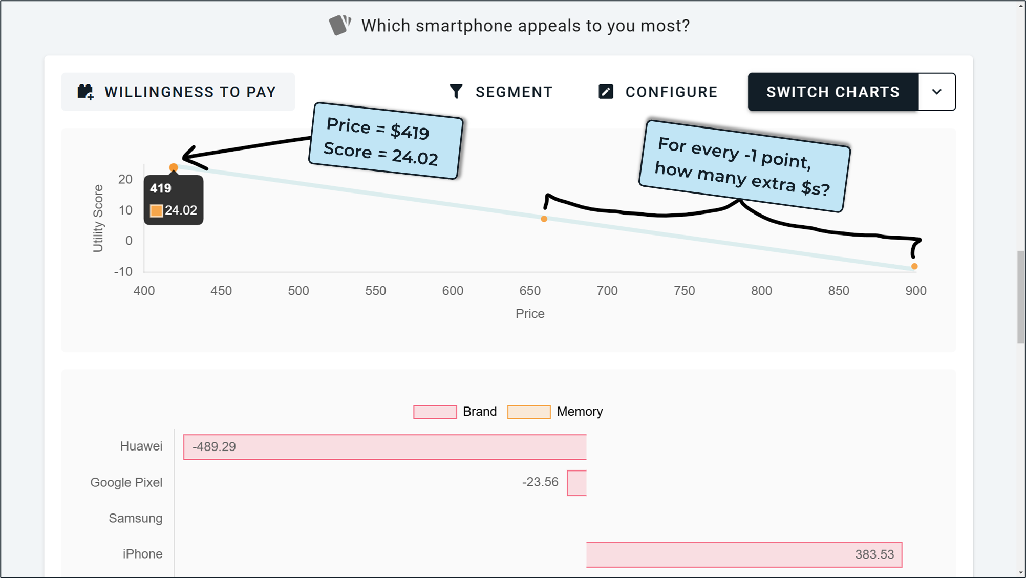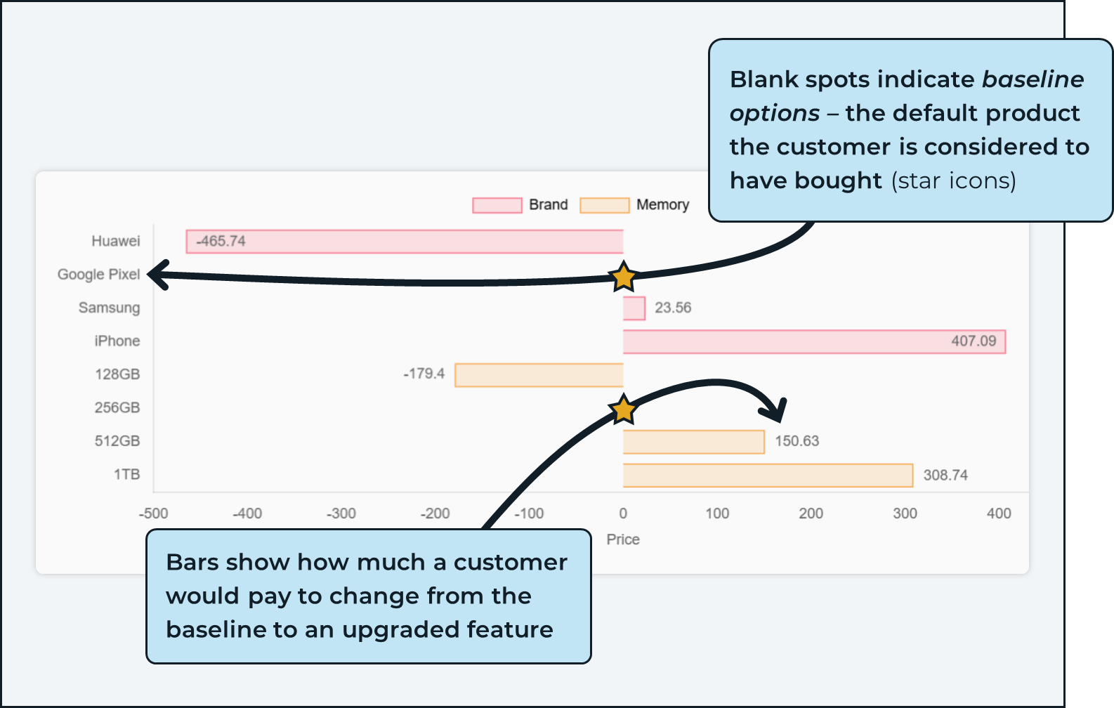 In the screenshot example, the "baseline product" is a Google Pixel smartphone with 256GB of storage, and it shows us that respondents would pay $150 extra to upgrade to a Google Pixel with 512GB of storage. Here's how you can read that from the chart: