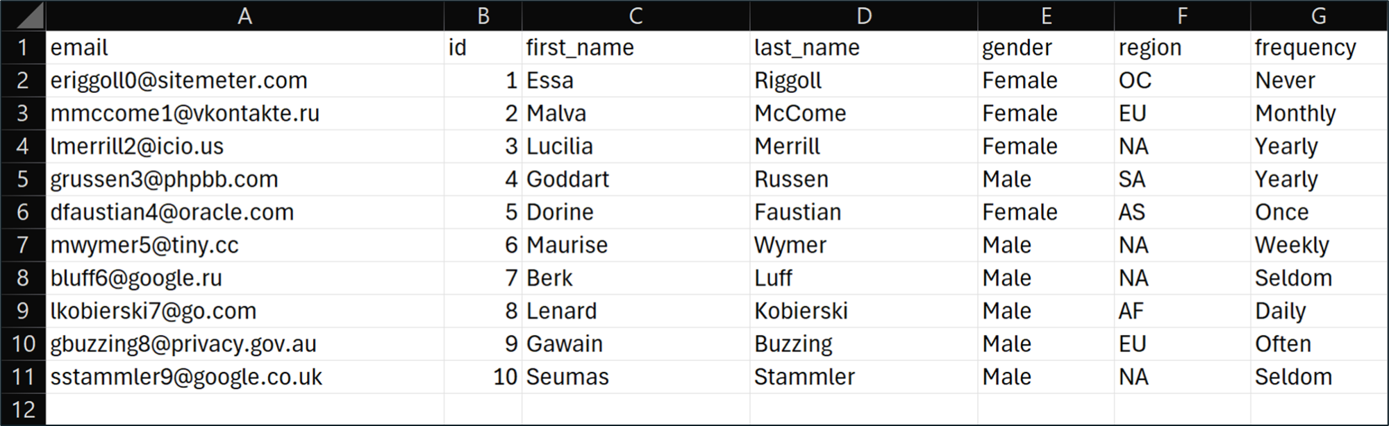 To start, you'll need to define the structure of your Enrichment Tab. You'll need to create a list of data point you want included as URL Parameters. Next, create a spreadsheet where each column represents one data type. Here's an example with Email, ID, First Name, Last Name, Gender, Region, and Product Usage Frequency: