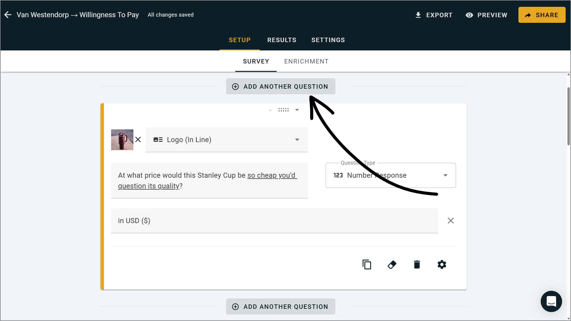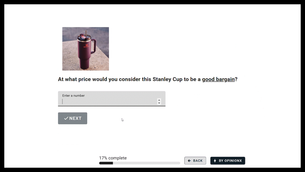 One ideal research scenario where Number Response is particularly useful is a Van Westendorp pricing study → this allows you to collect clean data that you can automatically feed into our free Google Sheet template to calculate your optimal price point.