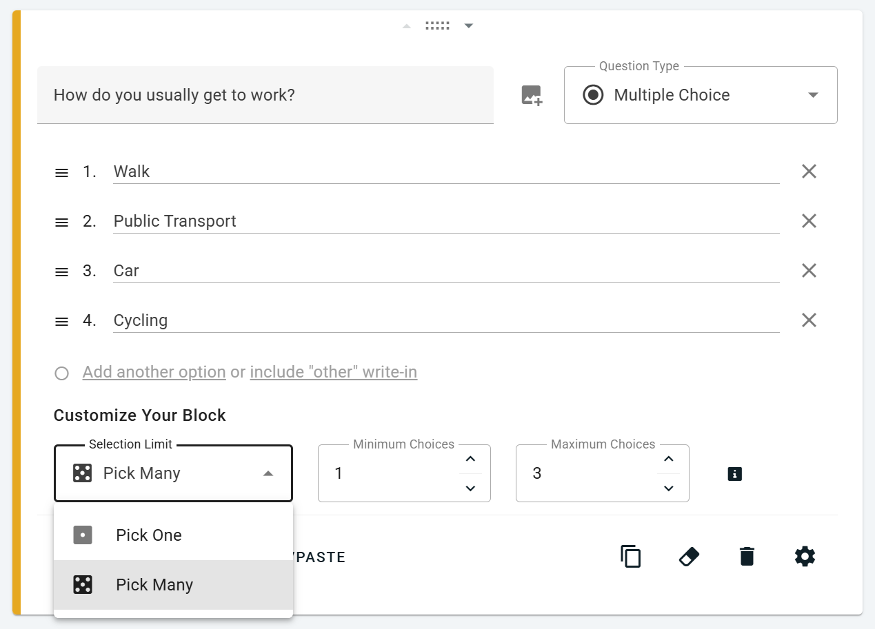 ^ The new “Pick One/Many” dropdown for Multiple Choice blocks, which is now shown by default during survey setup.