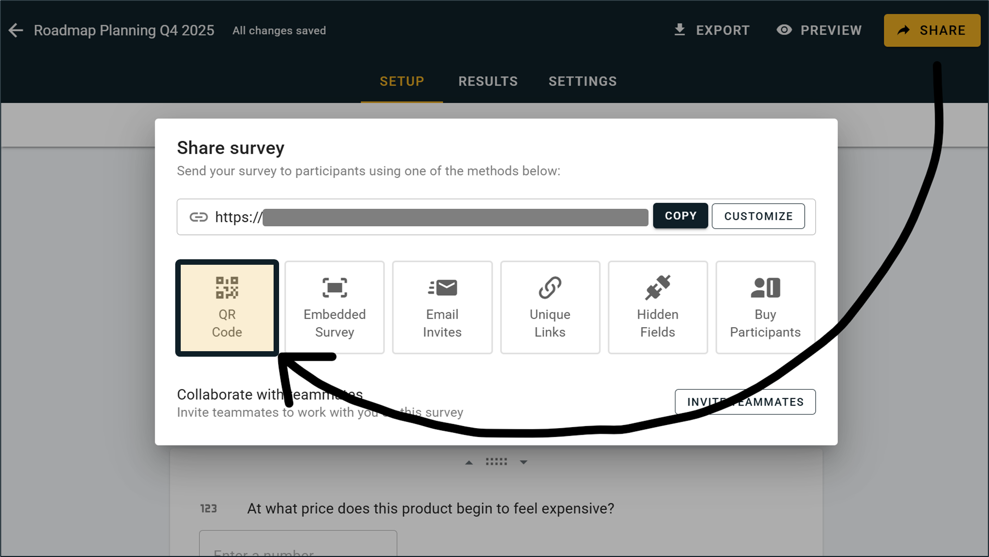 You can now distribute your survey to participants by QR Code. On the 'Share' menu, you'll see a new option for a personalized scannable image inside the QR Code option. This new distribution method is available for free to all users!
