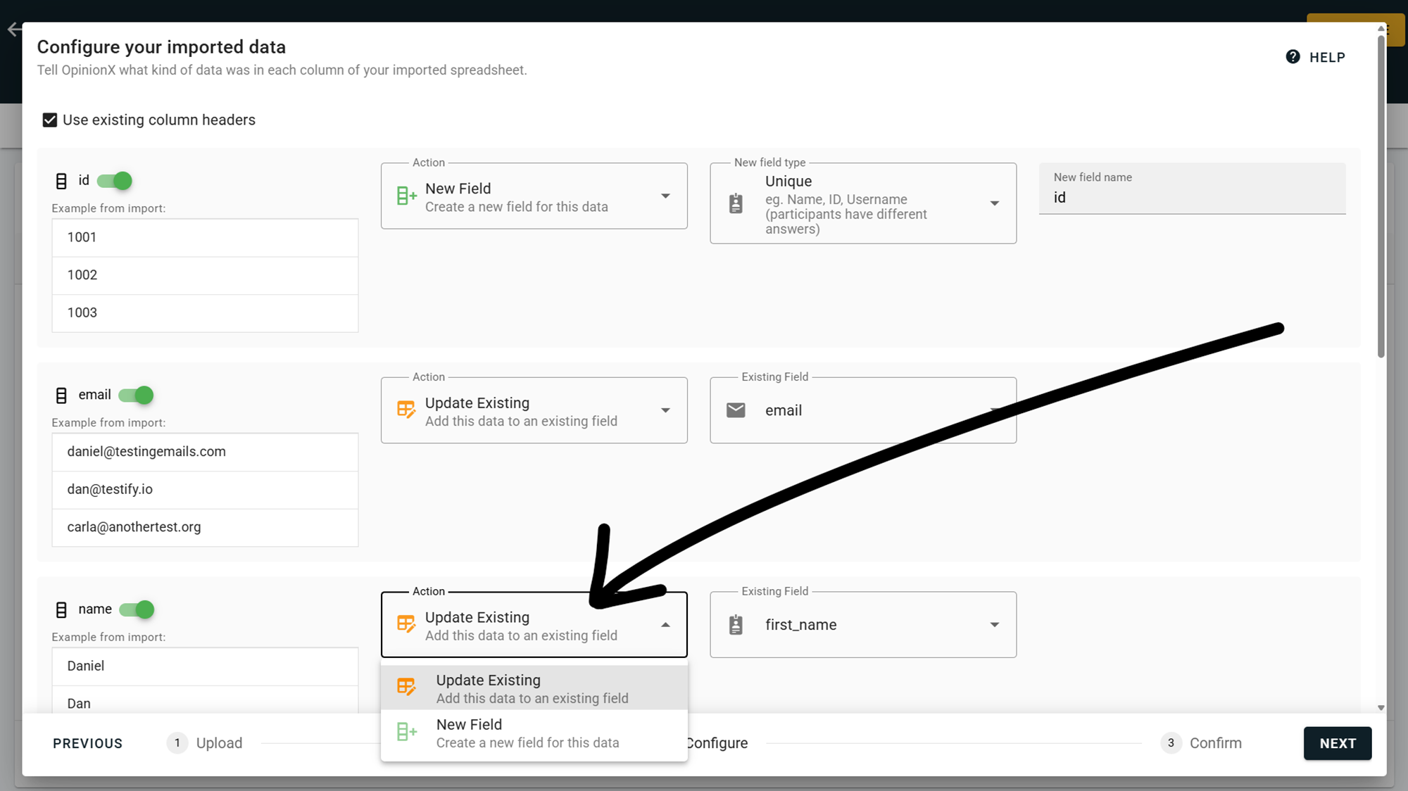 ▸ New Categories: If you include a value for a categorical field that doesn't already exist on your survey, it will be added as a new option.