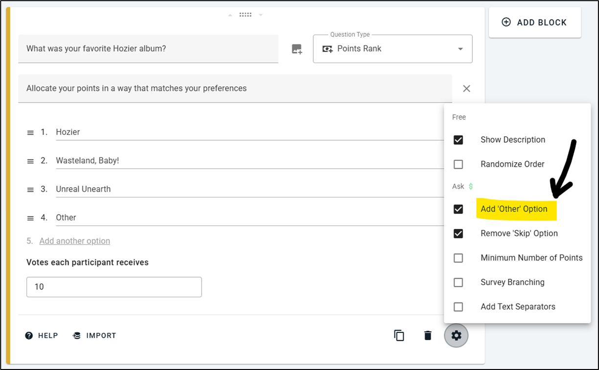 To add this feature to your survey, go to the Survey Setup Tab, go to your Order Rank or Points Rank block, click the block settings icon (), and enable the checkbox that says Add 'Other' Option.