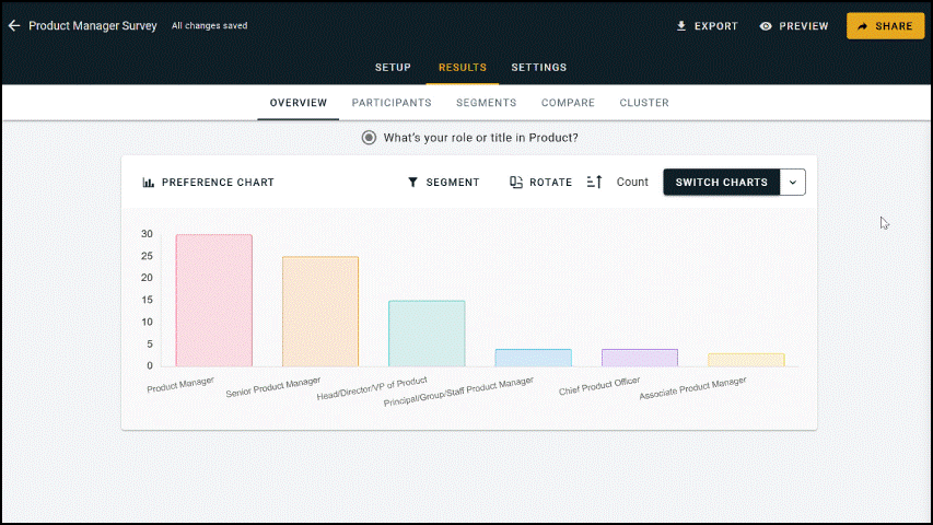 Profile Rank comes with a bunch of advanced charts that automatically turn your conjoint data into useful reports, such as a scenario simulator, preference chart, and ranked concepts list.