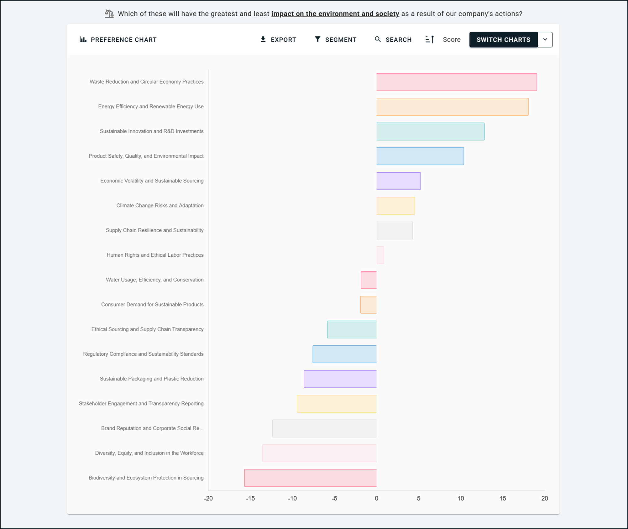 We've added a range of new chart types to OpinionX and more sorting settings for these charts (by score or alphabetically). On the Results Overview page, hit the "Switch Charts" button in the top-right corner of each results block and you'll find new options like:
