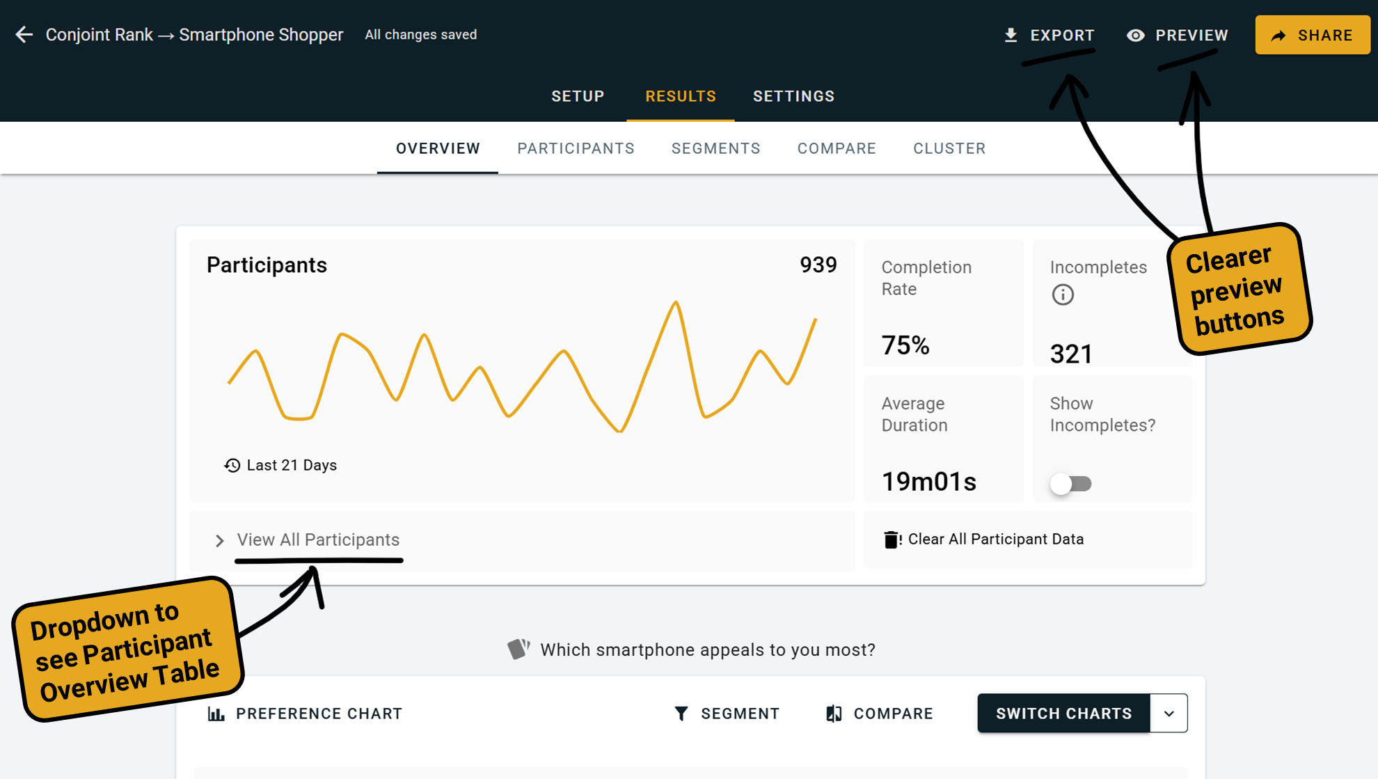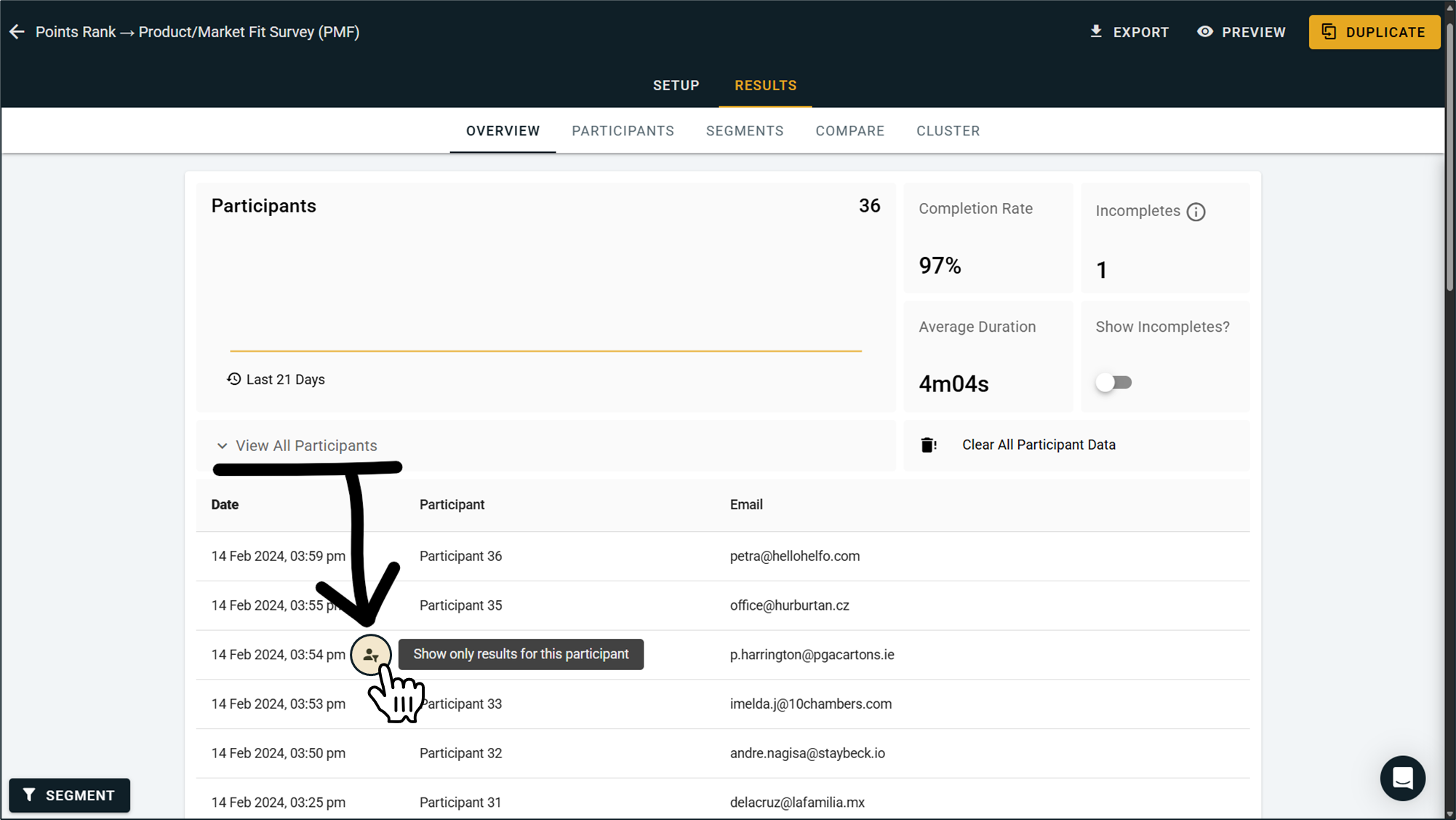 Once we added visual charts in last month's update, you guys were quick to ask for more ways to view specific types of data in the Overview Tab. We've added a new feature that let's you filter by individual participant. Open the 'View All Participants' dropdown table at the top of the Results Overview and hover over any participant's row to reveal a Participant Filter button. Clicking this will activate a filter for viewing this one participant's data in the overview page, including in any visual charts.