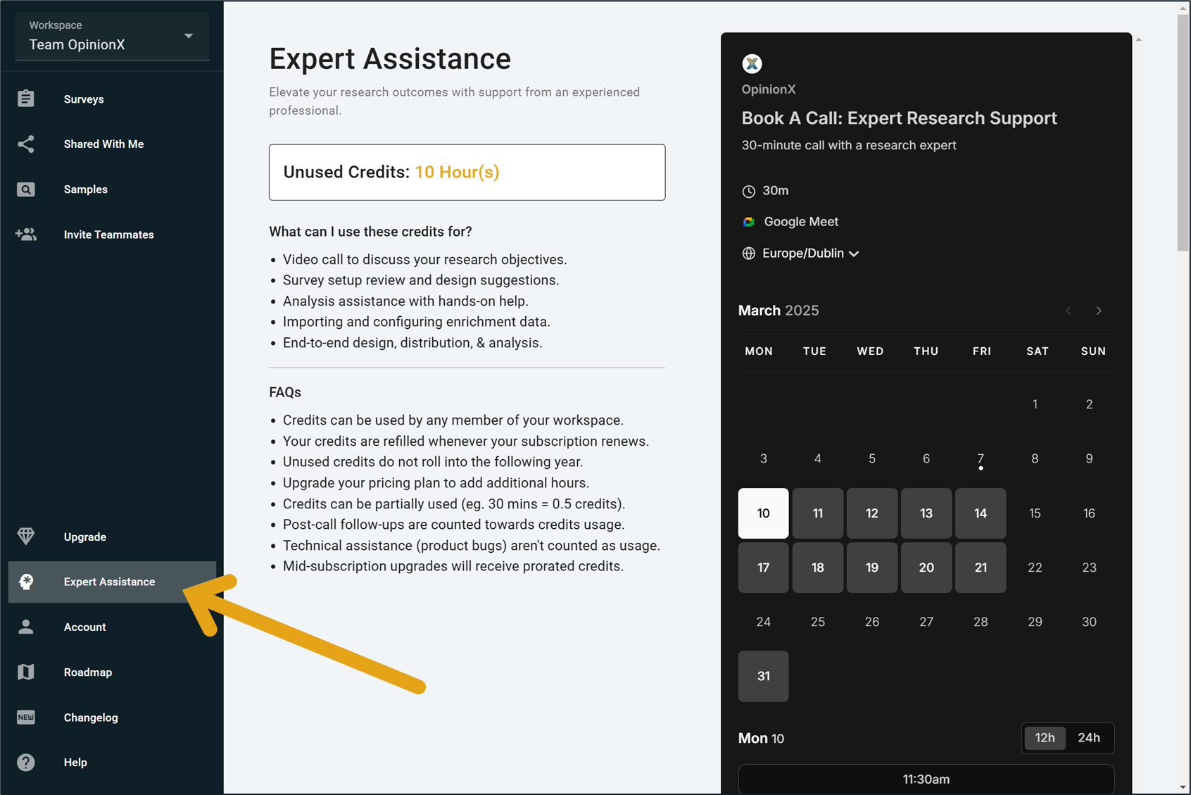 You'll see a new tab on your workspace titled Expert Assistance where you can see how many credits you have and to book calls with our experts. Credits can also be used on async work and are available to all members of your workspace to avail of. One-time survey upgrades are not currently eligible for prepaid credits, only yearly subscriptions receive them.