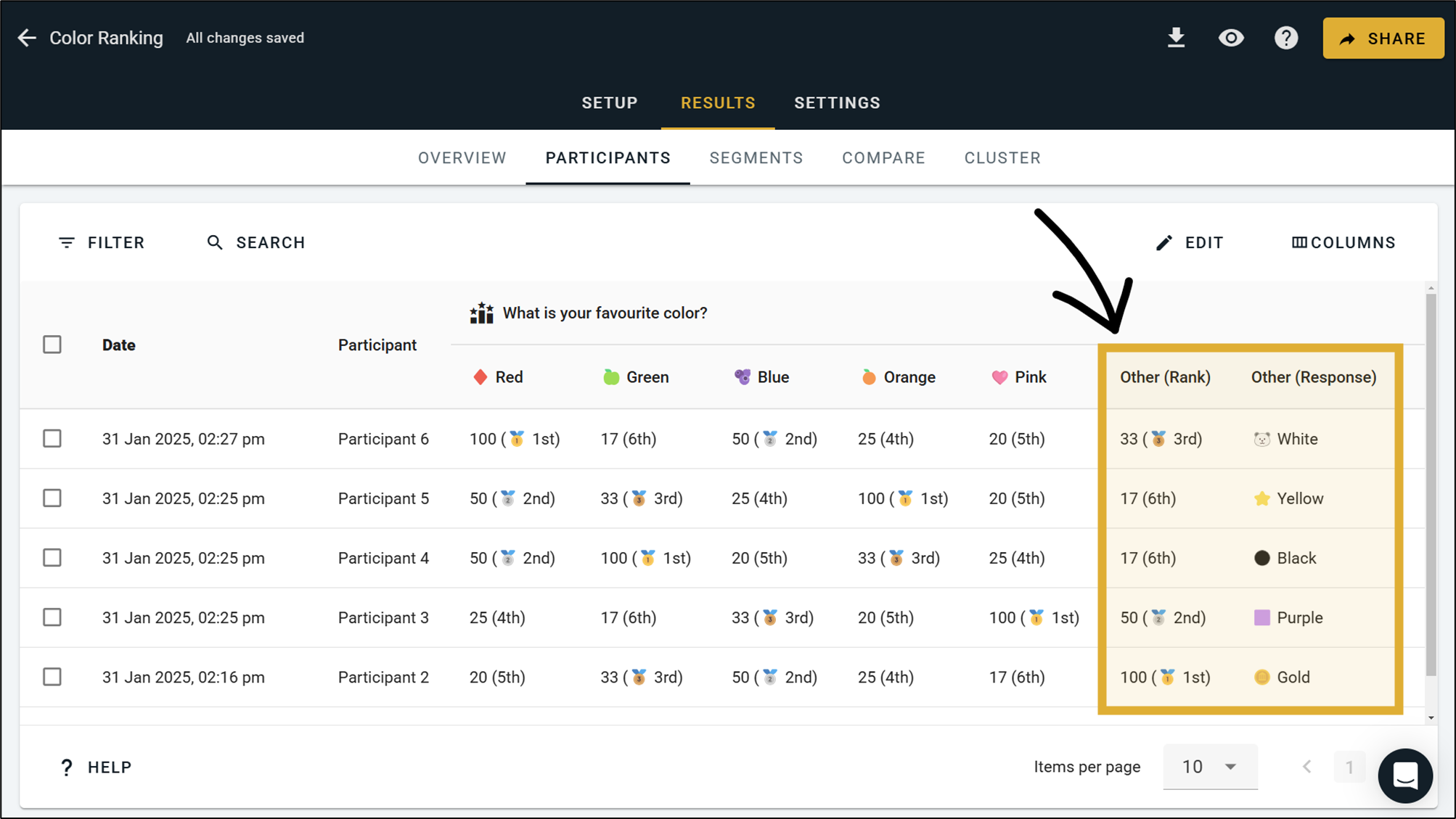 Over on the Participants Tab you can view the custom responses that each individual participant submitted and the ranked position or points they allocated to their own custom response.
