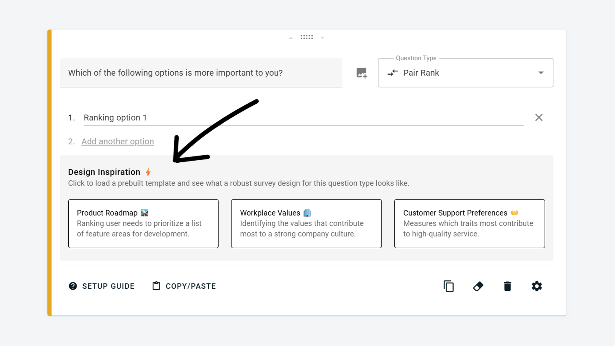When you create a new block on OpinionX, you’ll now see a “Design Inspiration” section. Clicking any of the white tiles here will prefill your block with a question and ranking options, helping you to see how that ranking method should look once ready to launch.
