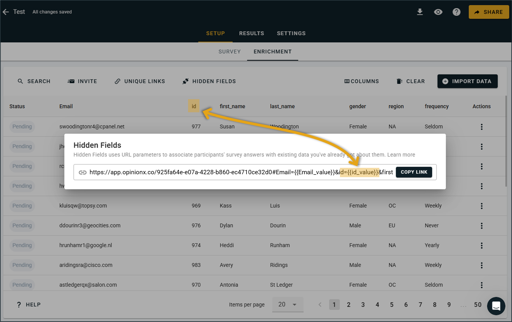 Now you're ready to copy your smart link and get your survey started! Alternatively, import a full dataset and use our built-in features for downloading a list of unique links for each participant or trigger email invites directly from inside OpinionX.