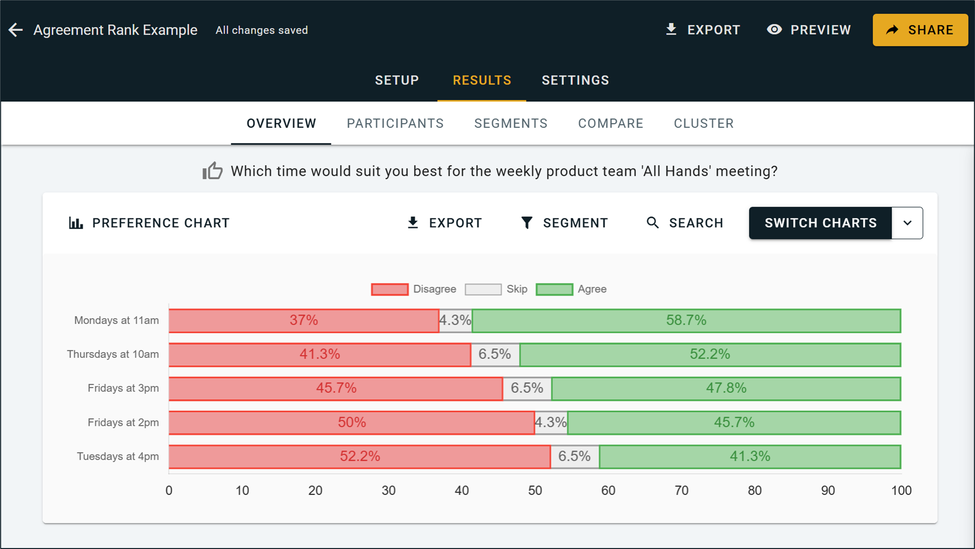^ Stacked Bar Charts for Agreement Rank, showing the breakdown between Agree, Disagree, and Skip votes