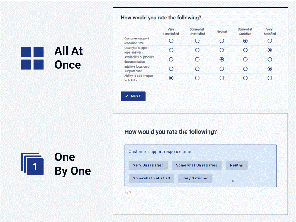 One By One → Each row turns into a card, transforming the table view into a series of quick votes (much better suited for mobile phones, and helps reduce straightlining).