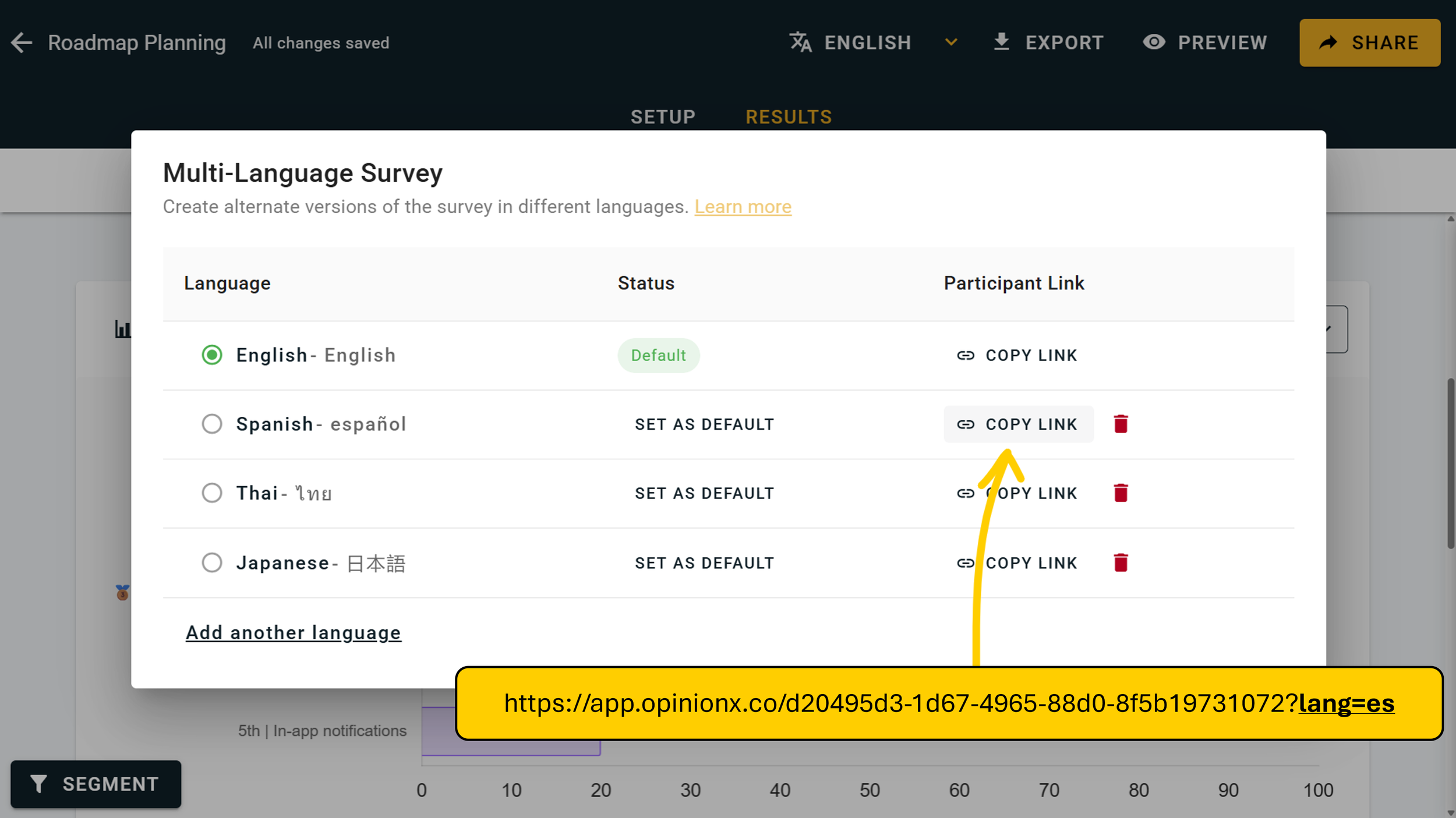 Best part of all? Multi-language surveys are available to all OpinionX users, including those on the free tier. There’s nothing you need to do to unlock this feature — simply hit the language button on the top navbar section of your survey dashboard: