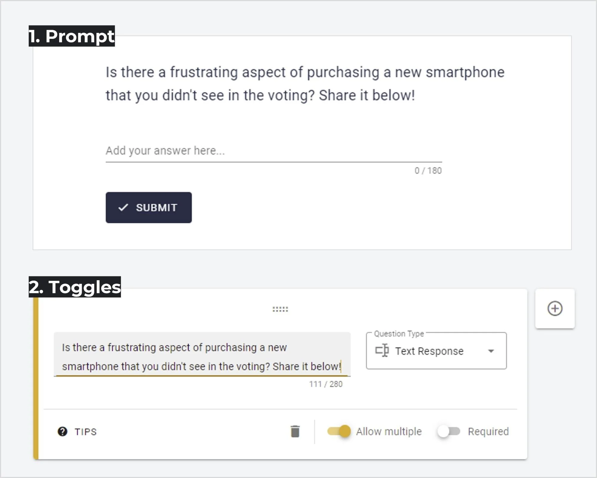 2. Toggles We've added additional customization opportunities by adding two new toggles to the Text Response block during survey setup: (i) 'Required' which lets you make responding mandatory for participants, and (ii) 'Allow multiple answers' which can be disabled to restrict participants to just one response, if required. This will not change the existing format of any of your surveys.