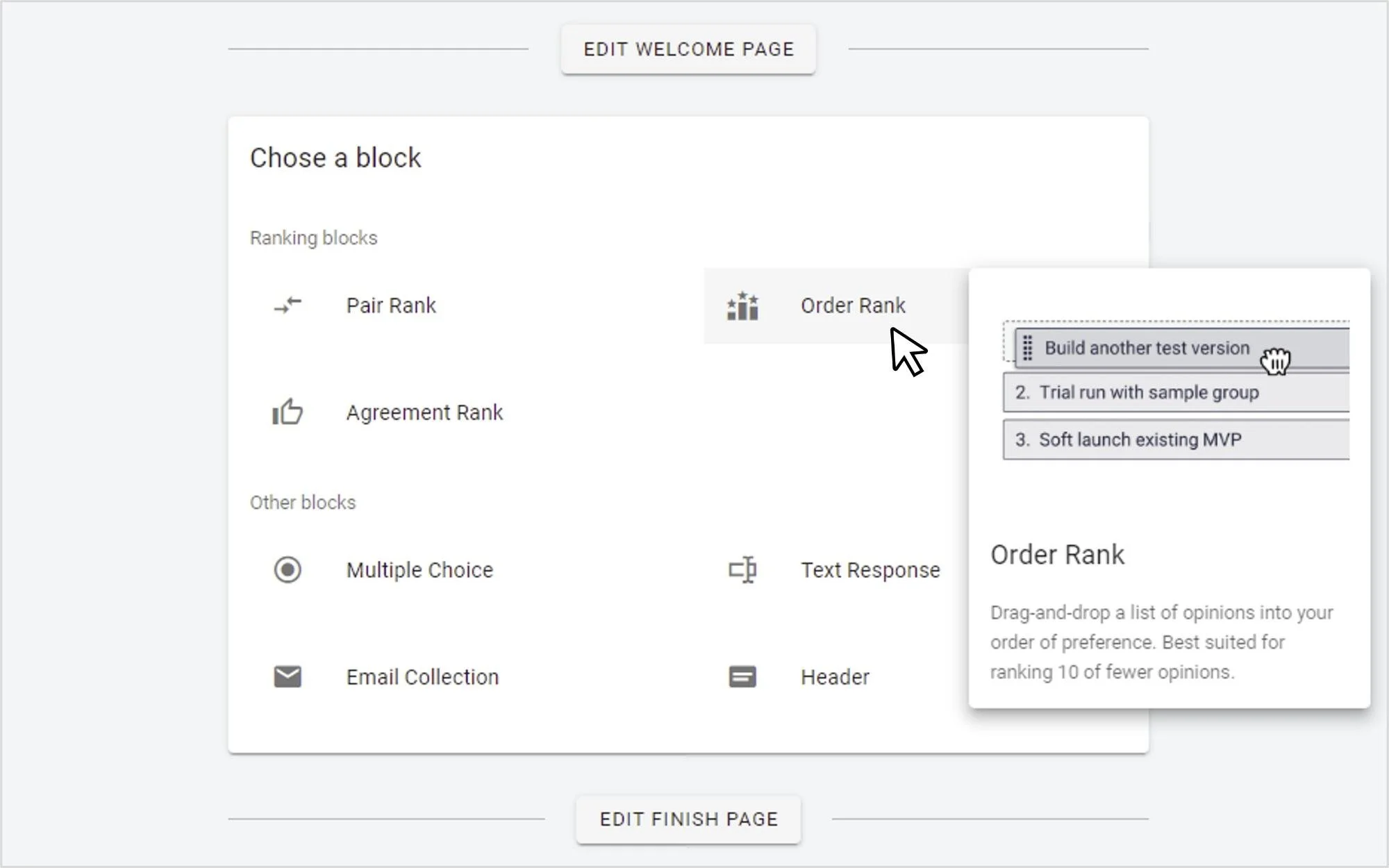 What We Did: We built a new ranking block for stack ranking surveys called Order Rank, available as of today for all surveys on OpinionX. Additionally, we've split the "agree/disagree" voting format into a separate block from Pair Rank and called it 'Agreement Rank'. This marks the first step in expanding the range of ranking methods available on OpinionX as we continue to work towards becoming the best ranking research tool possible.