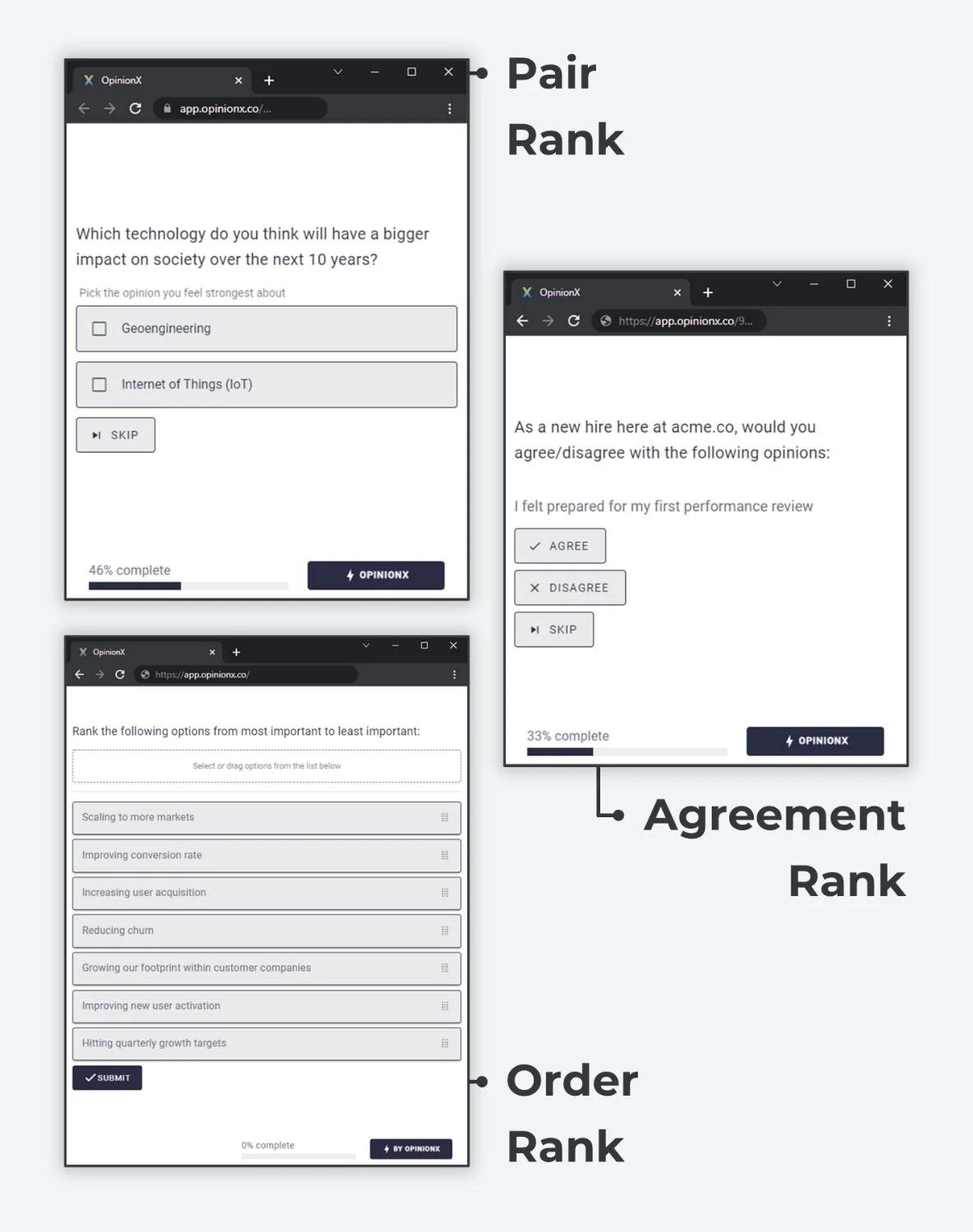 How It Works: When creating an OpinionX survey, simply switch the Pair Rank block to an Order Rank or Agreement Rank block. The setup process is identical otherwise. For participants, the Order Rank block will show the full list of all opinions you've included which they are asked to drag-and-drop into their order of preference.