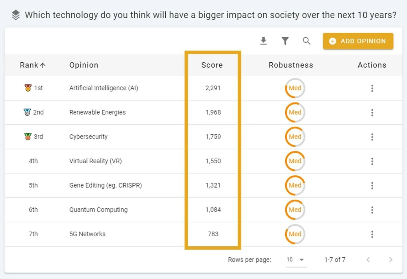 How It Works: Just like the 'Rank' column, the 'Score' is automatically calculated. To learn more about how the OpinionX algorithms compare and rate opinions, check out our Knowledge Base docs "What does the Score mean on OpinionX?" and the more detailed "How does the OpinionX rating algorithm work?".