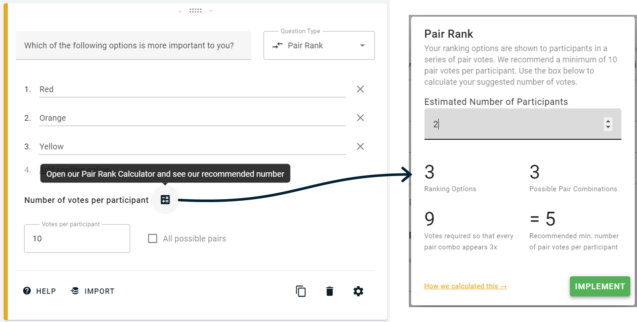 We've updated the Pair Rank Calculator, which now has a handy "Implement" button so that you can easily update your number of pair votes per participant in just one click.
