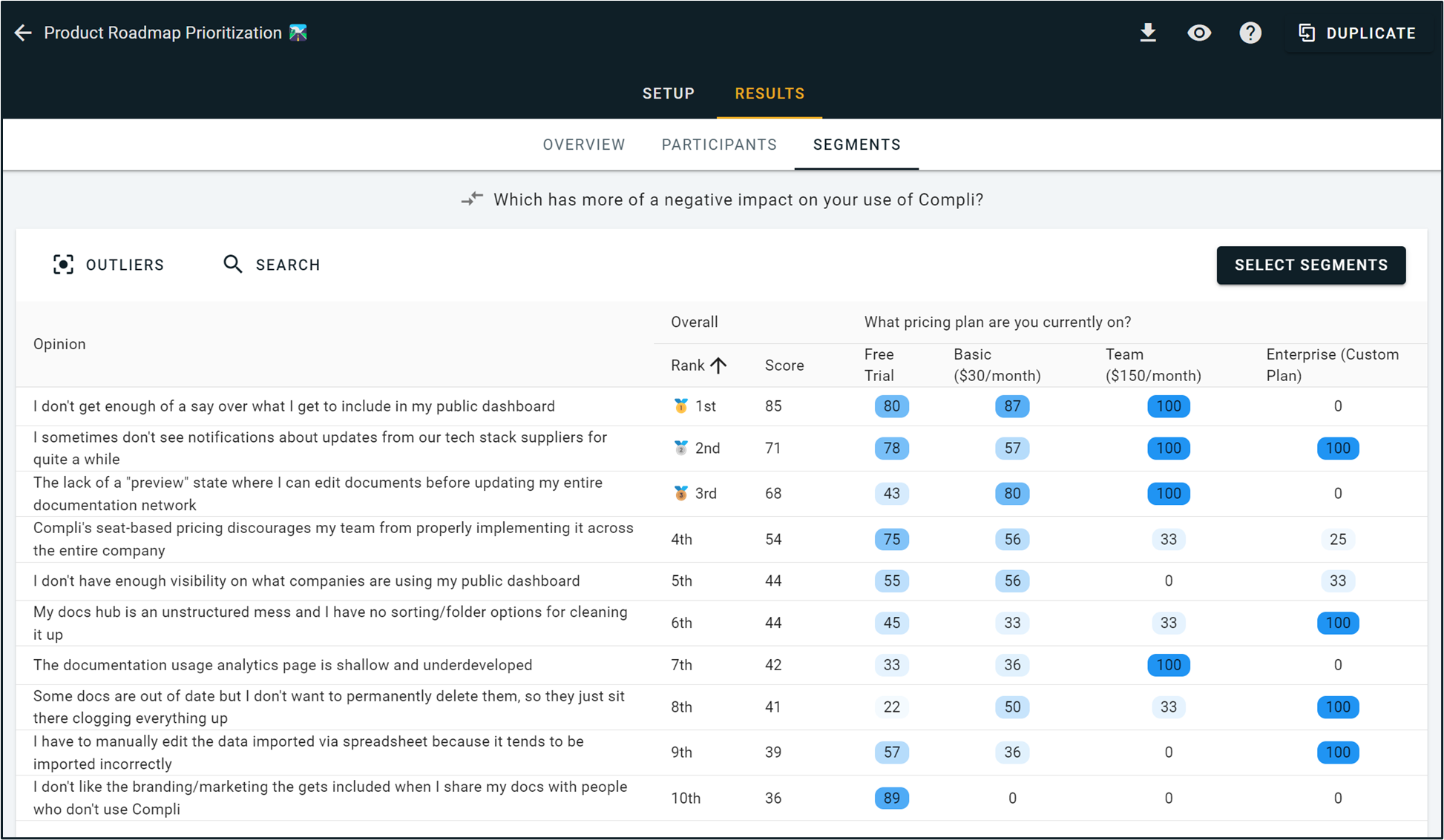 Here's a closer look at that same example to help you understand the Segments Tab a little better. In the screenshot below, we can see that customers on our "Basic" pricing plan gave the problem statement about "lack of a preview state" a score of 80/100 in this Pair Rank question: