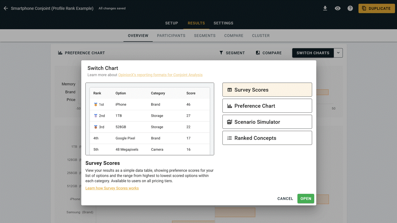Survey Scores → Simple data table with scores for each of your options (default chart, free for all users).