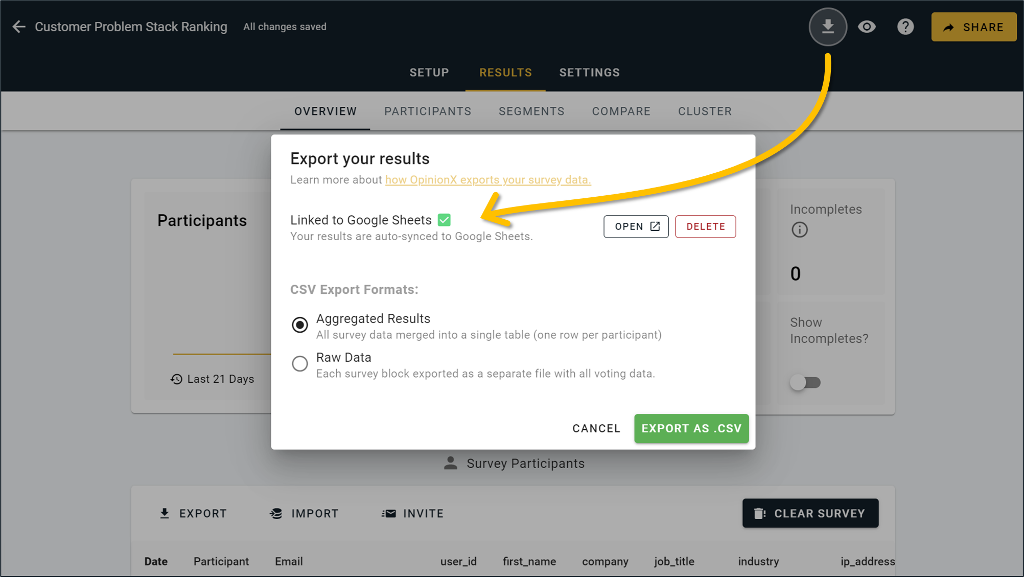 Connect your survey to Google Sheets and automatically sync your results to your linked sheet every time someone completes your survey. This new feature offers the PERFECT way to start building automated workflows using your OpinionX data. This integration is available to customers on the Analyze tier or higher.