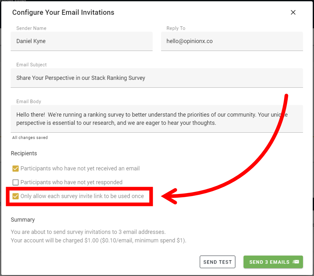Once you've imported your .CSV of customer data, you can either download a list of unique links to distribute to your participants or use the email invites feature to send each person their unique link directly from inside OpinionX.