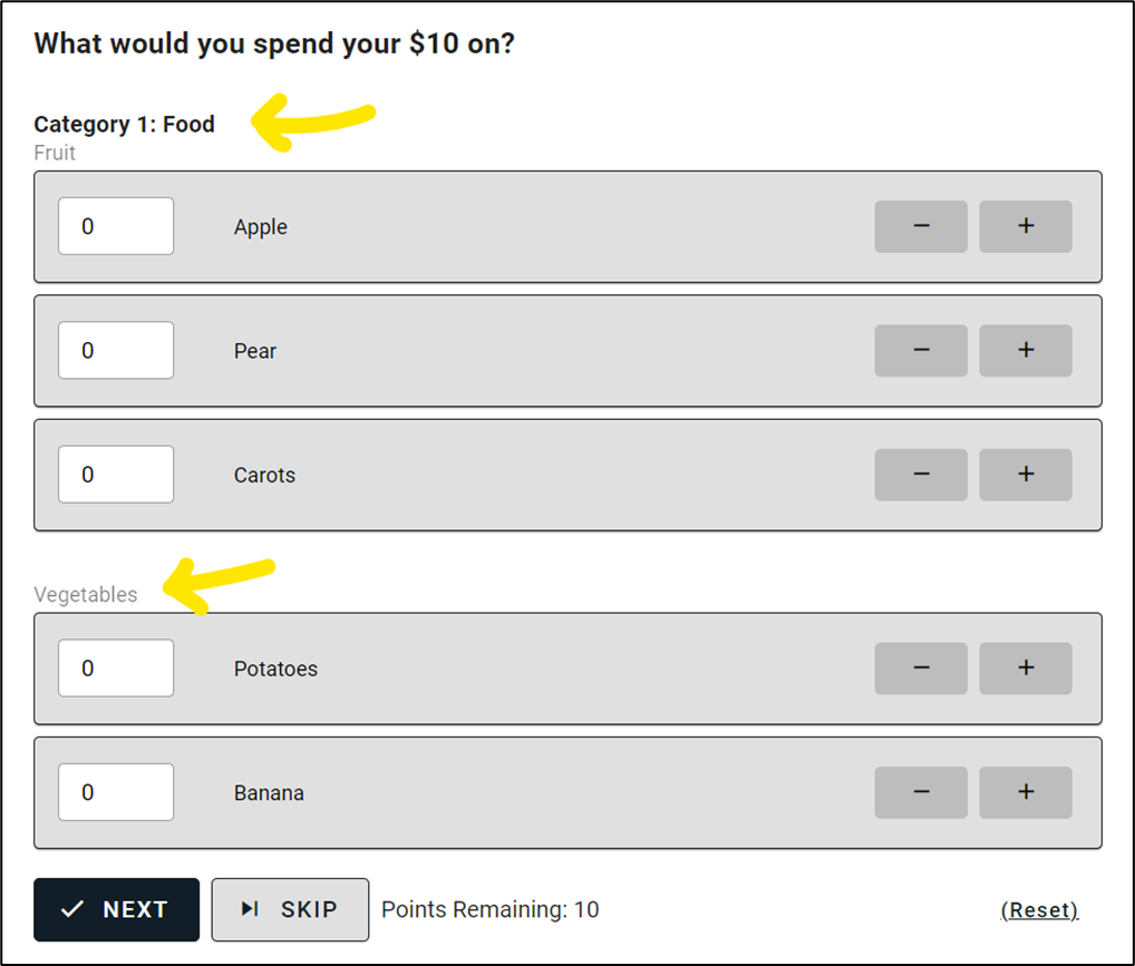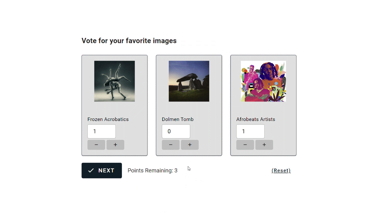Points Rank has also had a couple of changes: (1) The "Points Remaining" now appears both at the top and bottom of the list when it's too long to view on one screen, (2) there's now a "Reset" button to wipe your votes back to zero so you can start over, and (3) we've cleaned up some of the edge cases, such as allowing participants to add minus points or type a number larger than their remaining points.