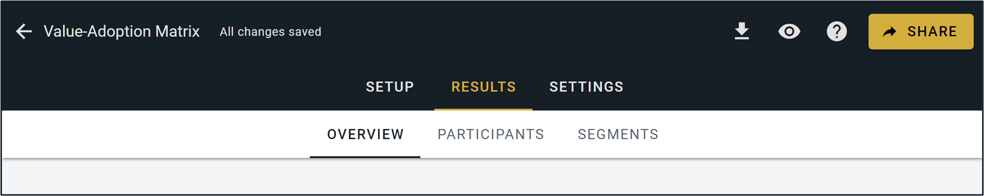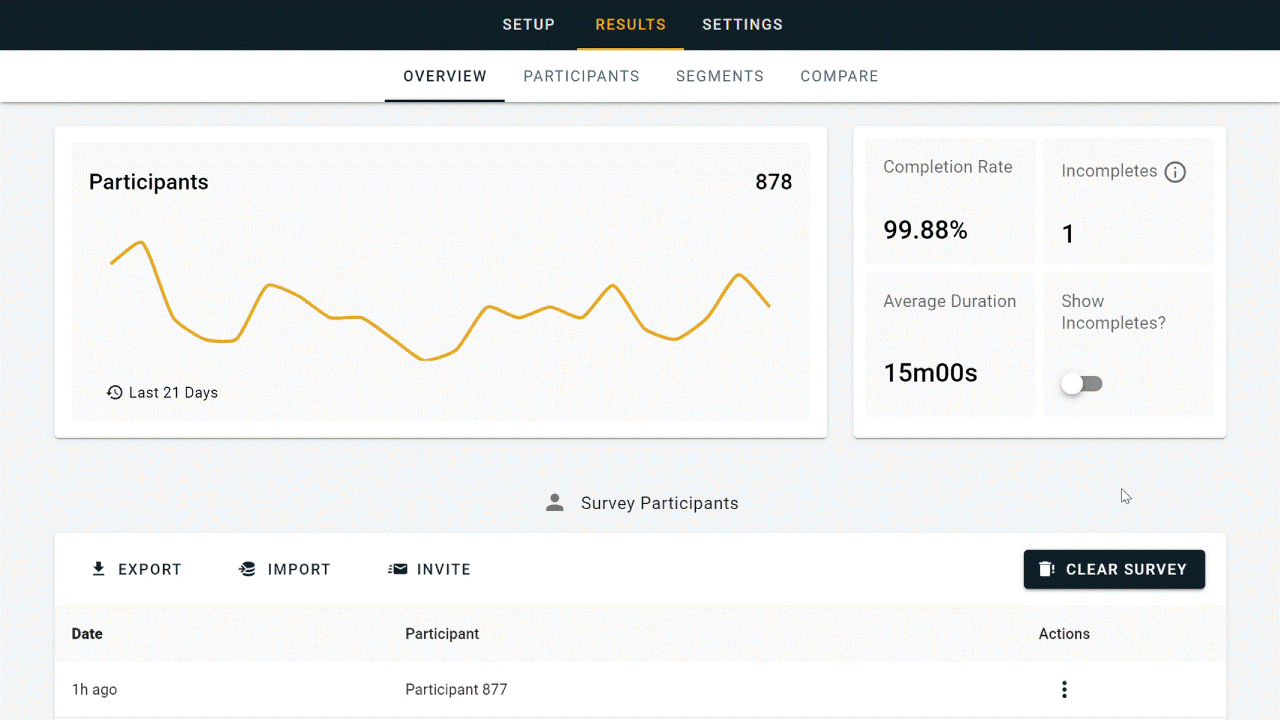 Your survey results on OpinionX are now divided into three tabs: Overview, Participants, and Segments.
