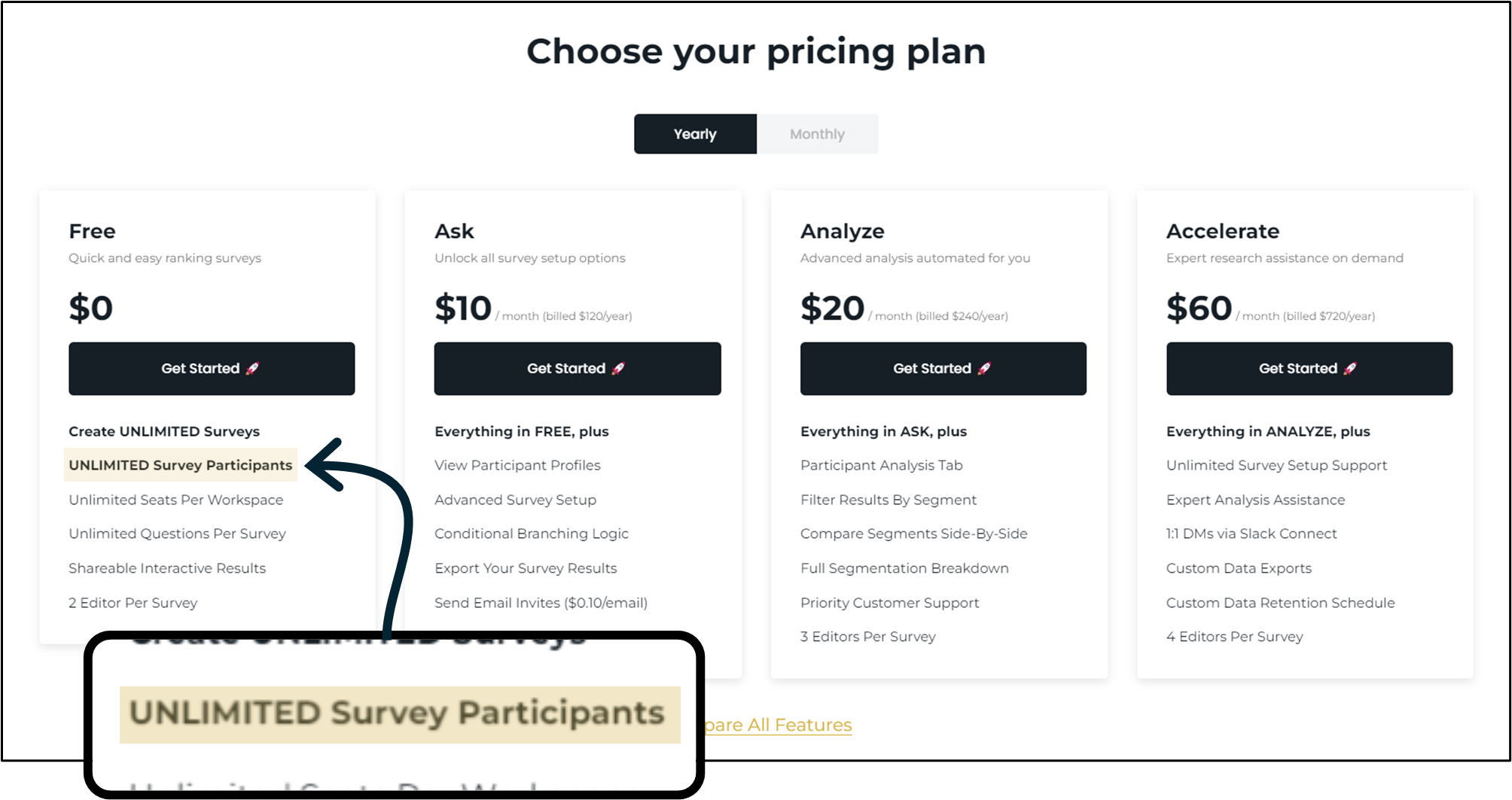 The Ask tier (formerly "Pro") now includes all our premium setup options for surveys like conditional branching, forced questions, custom survey URLs, and more. This tier also includes our new Import and Invite features. We've also added the "Participant Details" feature to this tier, meaning Ask customers can now view participant profiles and see what they voted on in their survey. All this for only $10/month on our yearly billing option.